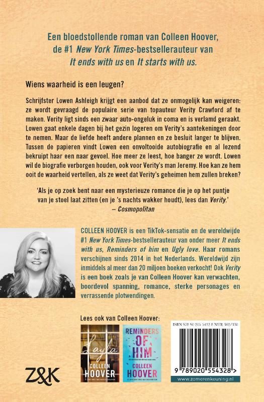 De spannende NA-thriller 'Verity' van Colleen Hoover gaat over schrijfster Lowen. Ze kan nauwelijks rondkomen, tot ze de kans van haar leven krijgt: ze mag de populaire boekenserie van Verity Crawford voltooien, die door een auto-ongeluk zelf niet meer kan schrijven. Als Lowen door Verity’s aantekeningen gaat, ontdekt ze een ongepubliceerde autobiografie die verborgen had moeten blijven. Ze besluit om het verhaal verborgen te houden, ook voor Verity’s man Jeremy. Maar dan krijgt ze gevoelens voor Jeremy. Hoelang kan Lowen de waarheid voor zich houden?