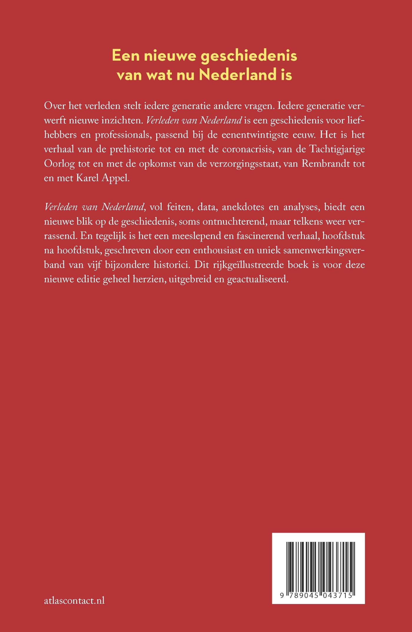 ‘Verleden van Nederland’ verschijnt in geheel vernieuwde heruitgave. Over het verleden stelt iedere generatie andere vragen. Iedere generatie verwerft nieuwe inzichten. ‘Verleden van Nederland’ is een geschiedenis voor liefhebbers en professionals, passend bij de eenentwintigste eeuw. Het is het verhaal van de prehistorie tot en met de coronacrisis, van de Tachtigjarige Oorlog tot en met de opkomst van de verzorgingsstaat, van Rembrandt tot en met Karel Appel.
