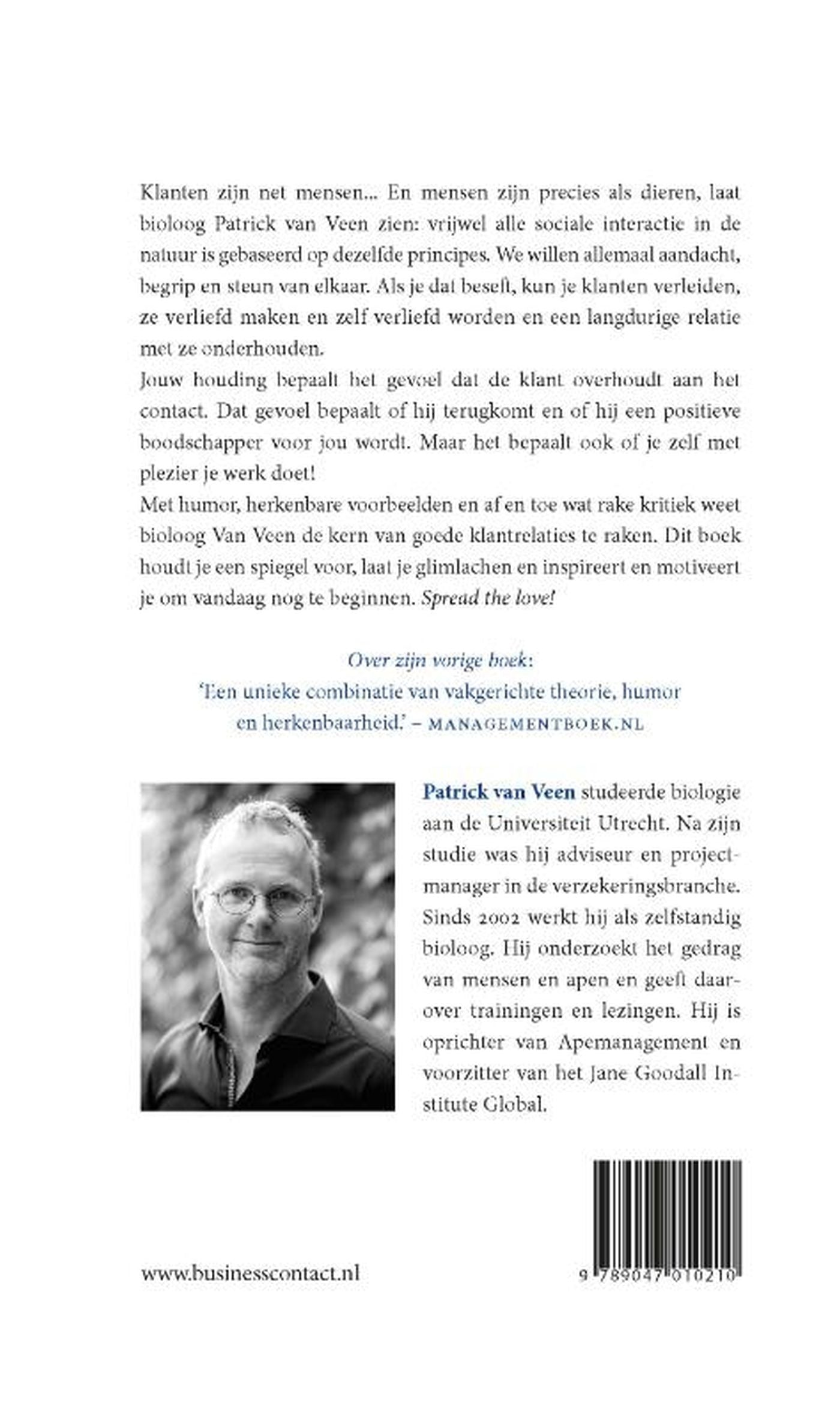 Klanten zijn net mensen... En mensen zijn precies als dieren laat bioloog Patrick van Veen zien: Vrijwel alle sociale interactie in de natuur is gebaseerd op dezelfde principes. We willen allemaal aandacht, begrip en steun van elkaar. Als je dat beseft, kun je klanten verleiden, ze verliefd maken en zelf verliefd worden, en een langdurige relatie met ze onderhouden.