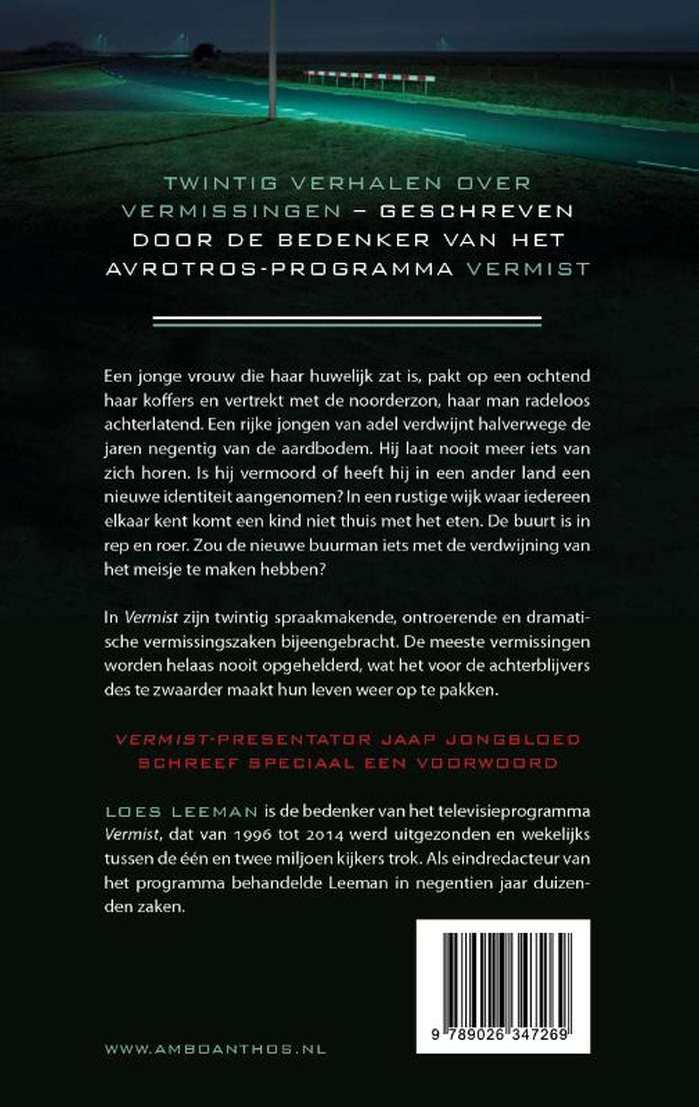 ‘Vermist’ bevat twintig true-crimeverhalen over spraakmakende vermissingen, geschreven door Loes Leeman, de bedenker van het AVROTROS-programma Vermist . Met een voorwoord van presentator Jaap Jongbloed.