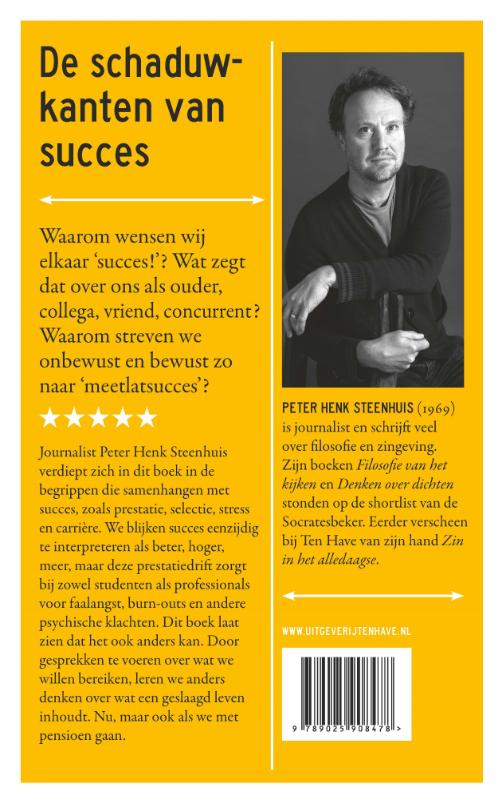Journalist Peter Henk Steenhuis verdiept zich in dit boek in de begrippen die samenhangen met succes, zoals prestatie, selectie, stress en carrière. We blijken succes eenzijdig te interpreteren als beter, hoger, meer, maar deze prestatiedrift zorgt bij zowel studenten als professionals voor faalangst, burn-outs en andere psychische klachten. Dit boek laat zien dat het ook anders kan. Door gesprekken te voeren over wat we willen bereiken, leren we anders denken over wat een geslaagd leven inhoudt. Nu, maar ook als we met pensioen gaan.
