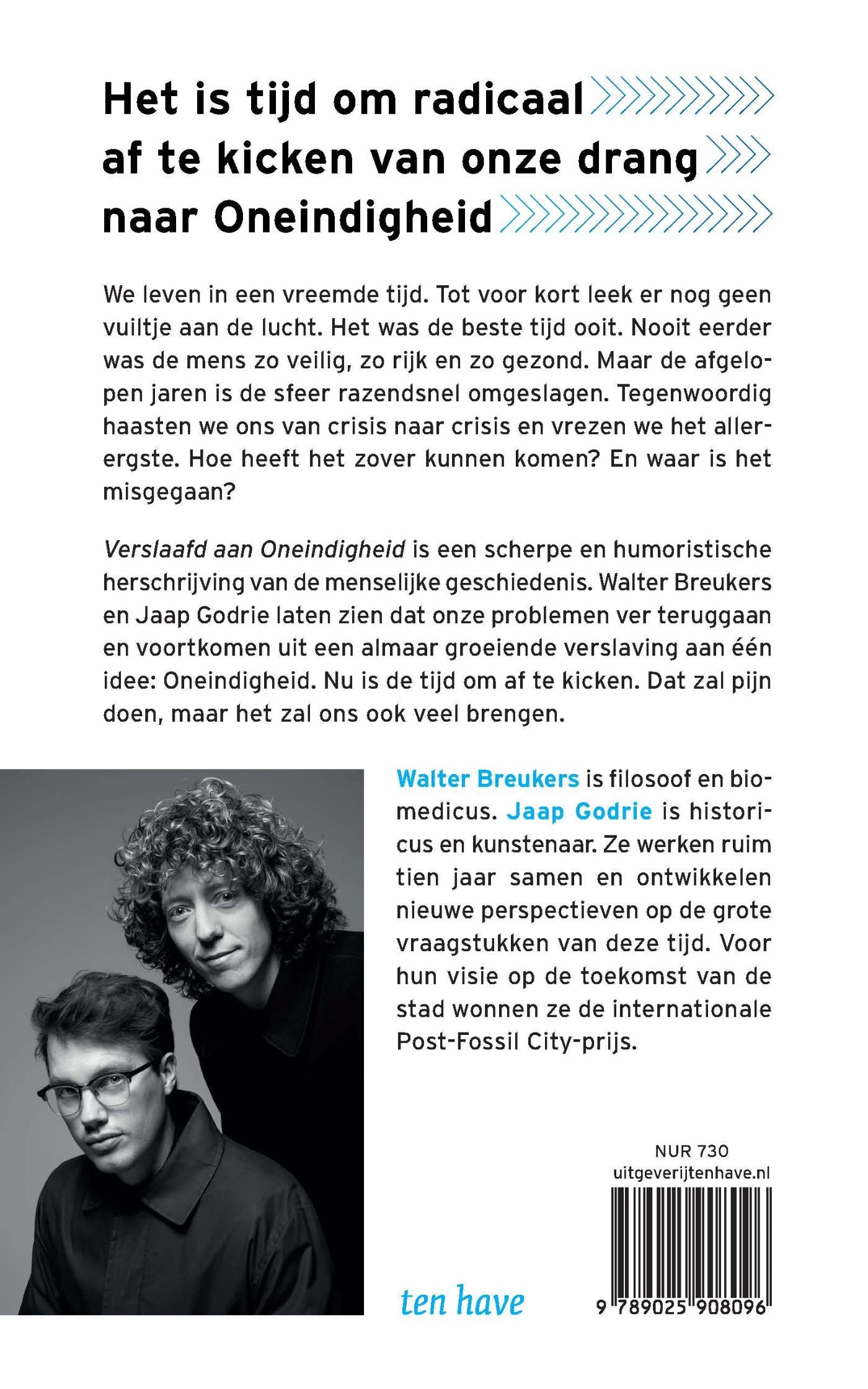 We leven in een vreemde tijd. Tot voor kort leek er nog geen vuiltje aan de lucht. Het was de beste tijd ooit. Nooit eerder was de mens zo veilig, zo rijk en zo gezond. Maar de afgelopen jaren is de sfeer razendsnel omgeslagen. Tegenwoordig haasten we ons van crisis naar crisis en vrezen we het allerergste. Hoe heeft het zover kunnen komen? Waar is het misgegaan? Breukers en Godrie laten zien dat onze problemen ver teruggaan en voortkomen uit een almaar groeiende verslaving aan één idee: Oneindigheid. Nu is de tijd om af te kicken.