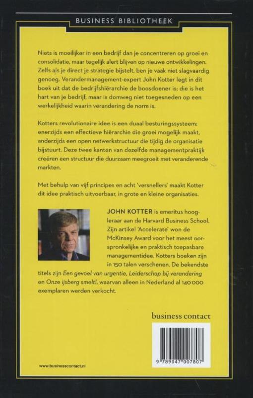 Kotters revolutionaire idee is een duaal besturingssysteem: enerzijds een effectieve hiërarchie die groei mogelijk maakt, anderzijds een open netwerkstructuur die tijdig de organisatie bijstuurt. Deze twee kanten van dezelfde managementpraktijk creëren een structuur die duurzaam meegroeit met veranderende markten.