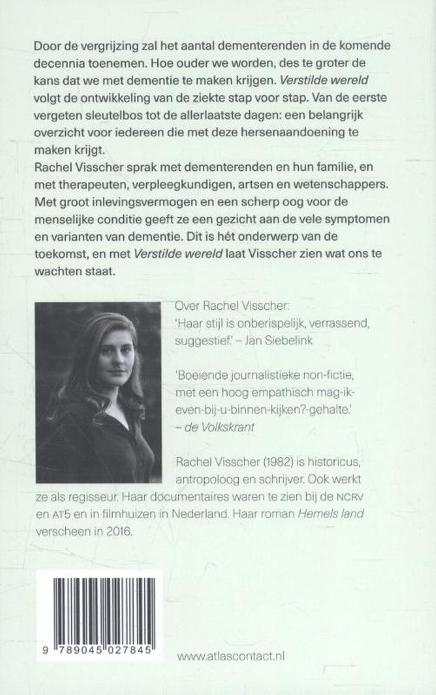 Rachel Visscher sprak met dementerenden en hun familie, en met therapeuten, verpleegkundigen, artsen en wetenschappers. Met groot inlevingsvermogen en een scherp oog voor de menselijke conditie geeft ze een gezicht aan de vele symptomen en varianten van dementie. Dit is hét onderwerp van de toekomst, en met Verstilde wereld laat Visscher zien wat ons te wachten staat.