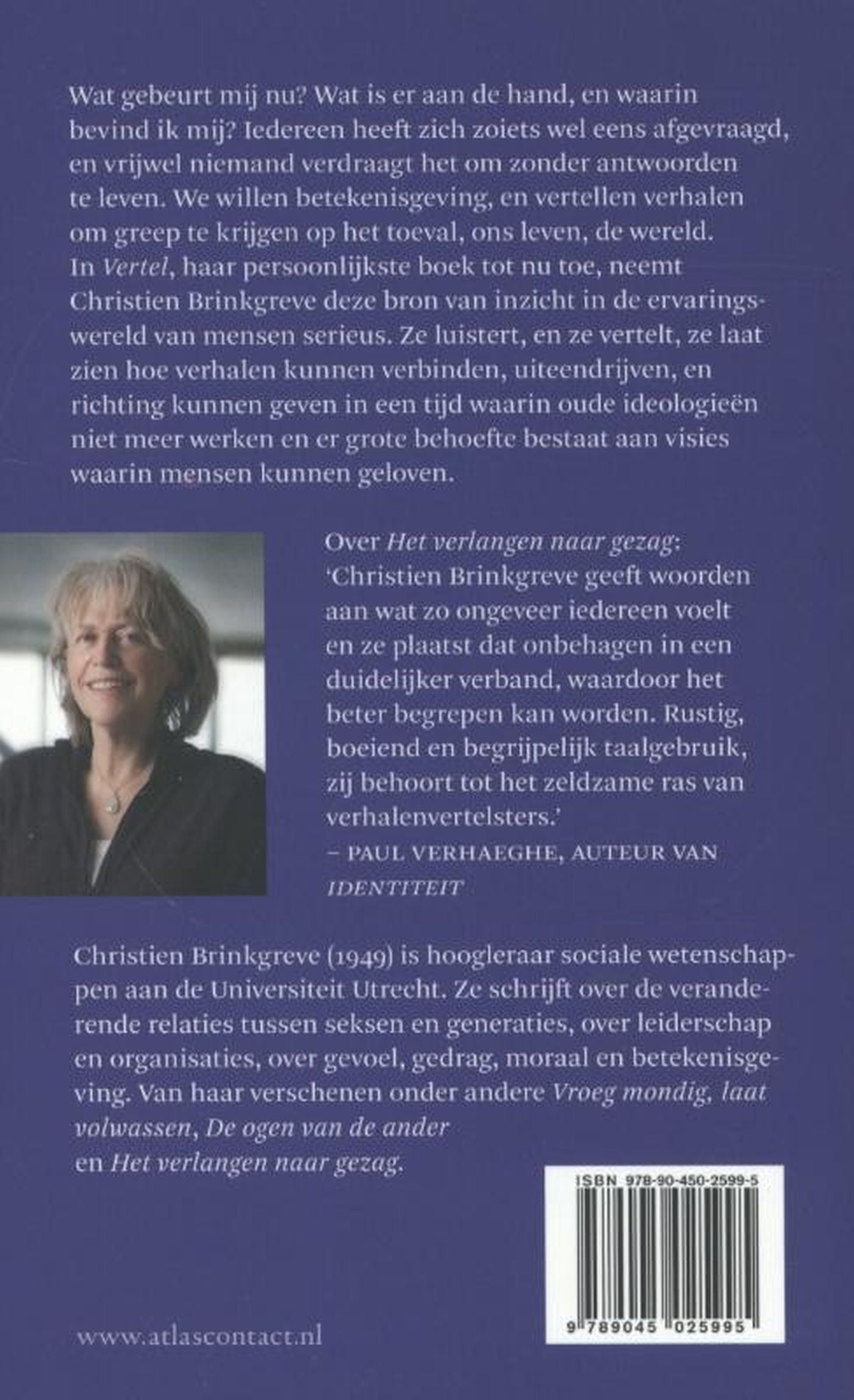 In Vertel, haar persoonlijkste boek tot nu toe, neemt Christien Brinkgreve deze bron van inzicht in de ervaringswereld van mensen serieus. Ze luistert, en ze vertelt, ze laat zien hoe verhalen kunnen verbinden, uiteendrijven, en richting kunnen geven in een tijd waarin oude ideologieën niet meer werken en er grote behoefte bestaat aan visies waarin mensen kunnen geloven.