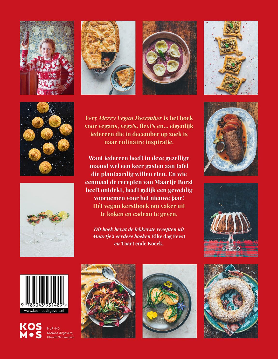 Very Merry Vegan December bevat de lekkerste recepten uit Maartje’s eerdere boeken Elke dag Feest, Taart ende Koeck, Man.Eat.Plant (i.s.m. Lisette Kreischer) en Family.Eat.Plant (i.s.m. Lisette Kreischer), en is het kerstkook- en bakboek om te geven of zelf te gebruiken.