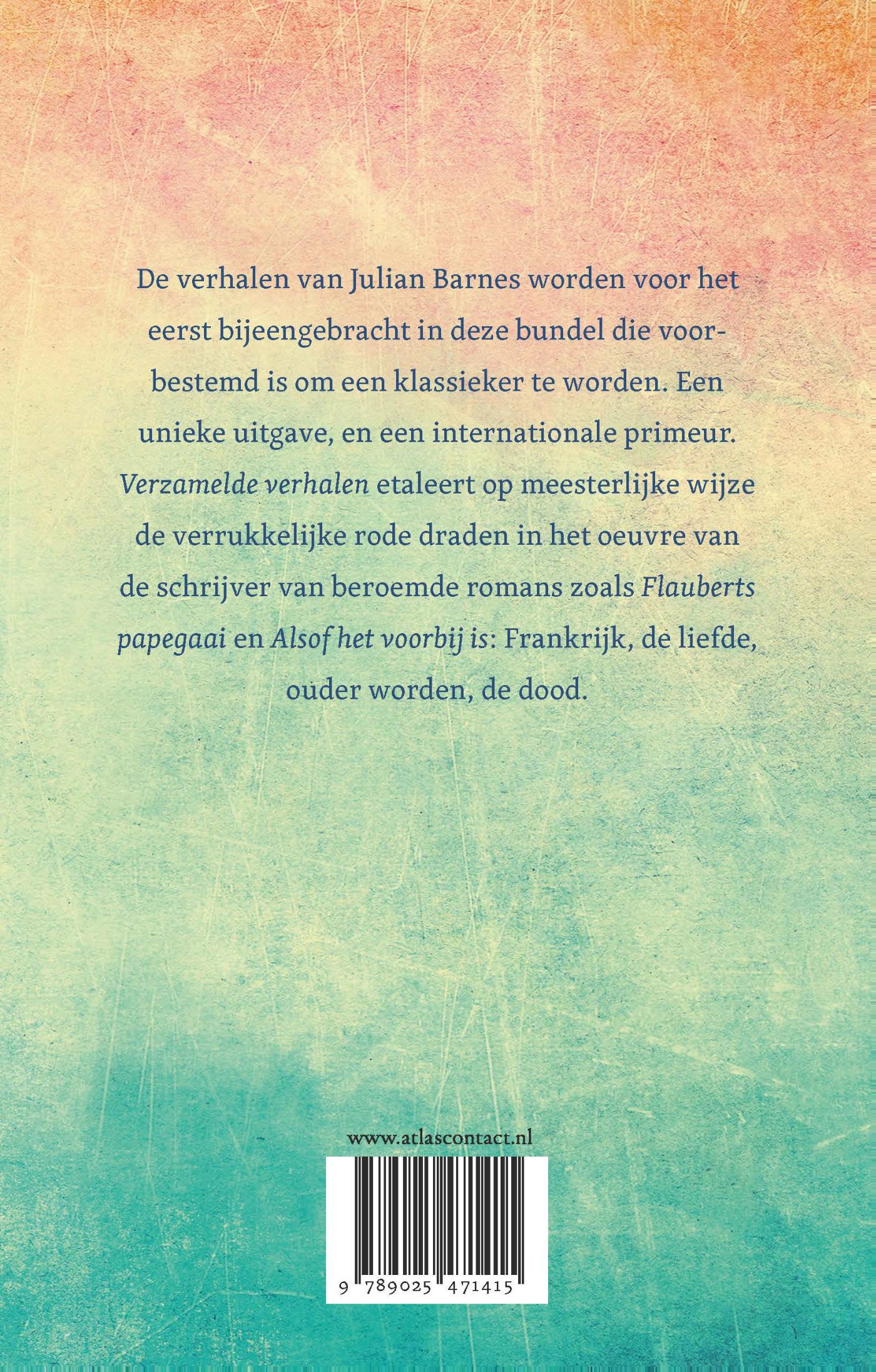 In ‘Verzamelde verhalen’ worden voor het eerst de verhalen van Julian Barnes bijeengebracht. De schrijver van een rijk oeuvre dat verpletterende romans zoals bestsellers ‘Alsof het voorbij is’ en ‘Het enige verhaal’ bevat, maar ook onconventionele biografieën als ‘De man in de rode mantel’, wijdt zich ook regelmatig aan de kortere prozavorm. Van Barnes verschenen de afgelopen decennia drie verhalenbundels en één nagekomen los verhaal. ‘Verzamelde verhalen’ is een unieke uitgave, en een internationale primeur. Het etaleert op meesterlijke wijze de verrukkelijke rode draden in het oeuvre van Barnes: Frankrijk, de liefde, ouder worden, de dood. Geestig, scherp geobserveerd, licht ironisch, weemoedig, met een enkel zwart randje: de ‘Verzamelde verhalen’ zijn voorbestemd een klassieker te worden in het oeuvre van Julian Barnes.