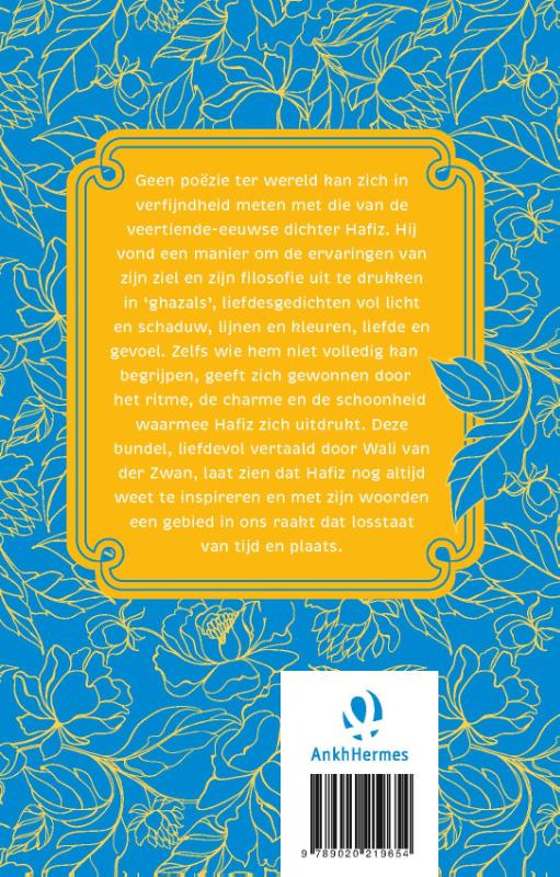 Hafiz, verzen uit het boek van de ziel werd liefdevol vertaald door Wali van der Zwan. De veertiende-eeuwse dichter Hafiz vond een manier om de ervaringen van zijn ziel en zijn filosofie uit te drukken in poëzie. De ziel zelf is muziek en als de ziel de realisatie van de goddelijke waarheid ervaart, wil de ziel zich uiten in verzen. En wat voor verzen! Gedichten vol licht en schaduw, lijnen en kleuren, verzen vol gevoel. Geen poëzie ter wereld kan zich in verfijndheid meten met die van Hafiz. Zelfs wie hem niet volledig kan begrijpen, geeft zich gewonnen door het ritme, de charme en de schoonheid waarmee hij zich uitdrukt. Het feit dat zijn verzen ons over een tijdboog van eeuwen nog steeds kunnen inspireren, toont aan dat Hafiz met zijn woorden een gebied raakt dat losstaat van tijd en plaats.