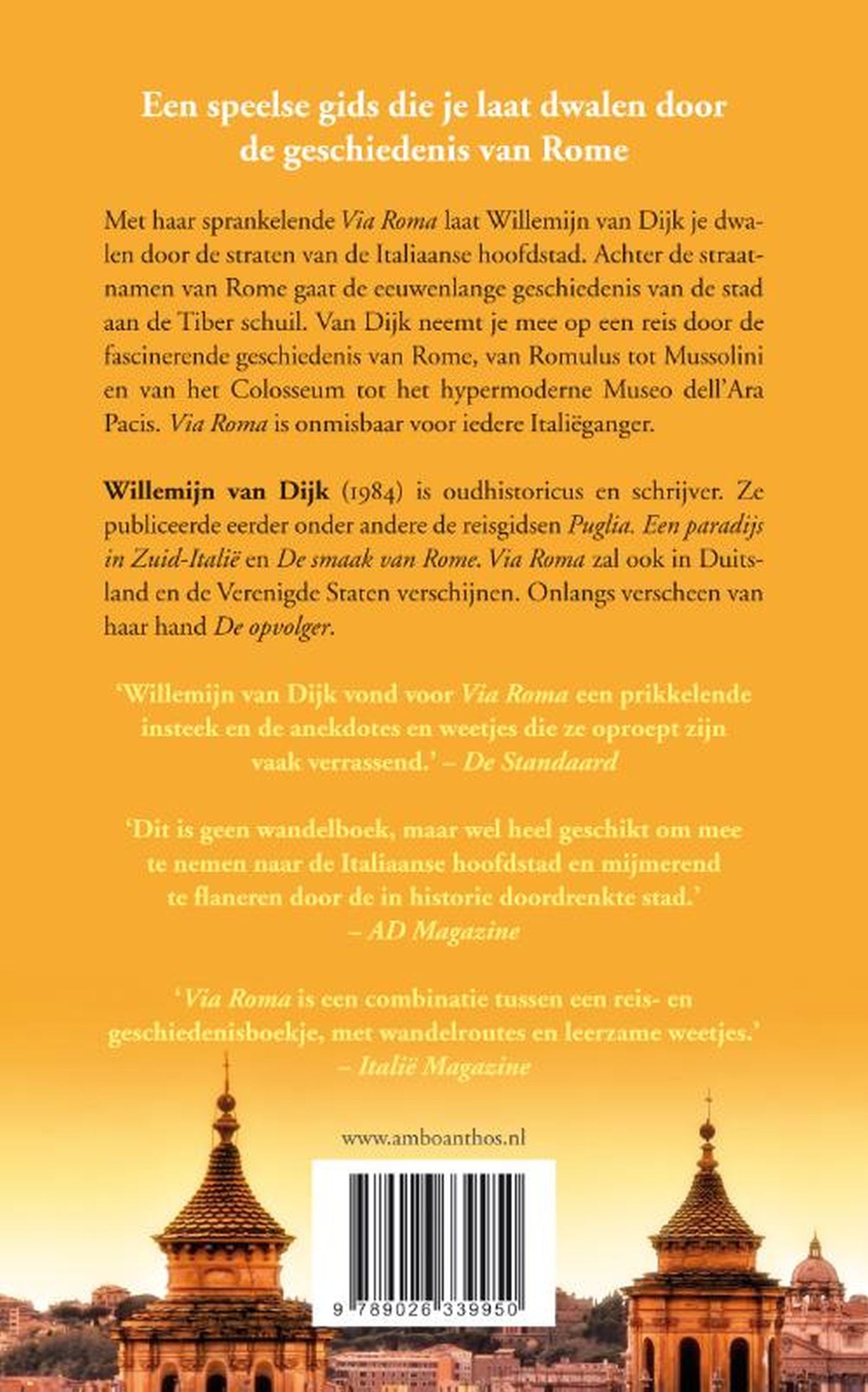 In haar sprankelende reisgids Via Roma laat Willemijn van Dijk je dwalen door de straten van de Italiaanse hoofdstad. Achter de straatnamen van Rome gaat de eeuwenlange geschiedenis van de stad aan de Tiber schuil. Via de straatnaambordjes dwaal je door de geschiedenis en langs het werelderfgoed van Rome, van Romulus tot Mussolini en van het Colosseum tot het hypermoderne Museo dell’Ara Pacis. Via Roma is een onmisbaar boek voor iedere Italiëganger.