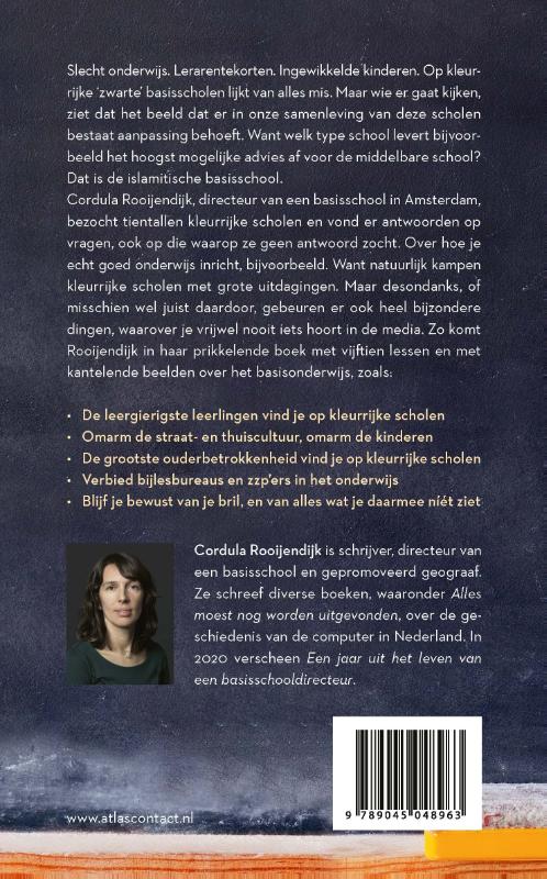 Cordula Rooijendijk, directeur van een basisschool in Amsterdam, bezocht tientallen kleurrijke scholen en vond er antwoorden op vragen, ook op die waarop ze geen antwoord zocht. Over hoe je echt goed onderwijs inricht, bijvoorbeeld. Want natuurlijk kampen kleurrijke scholen met grote uitdagingen. Maar desondanks, of misschien wel juist daardoor, gebeuren er ook heel bijzondere dingen, waarover je vrijwel nooit iets hoort in de media. Zo komt Rooijendijk in haar prikkelende boek met vijftien lessen en met kantelende beelden over het basisonderwijs, zoals: