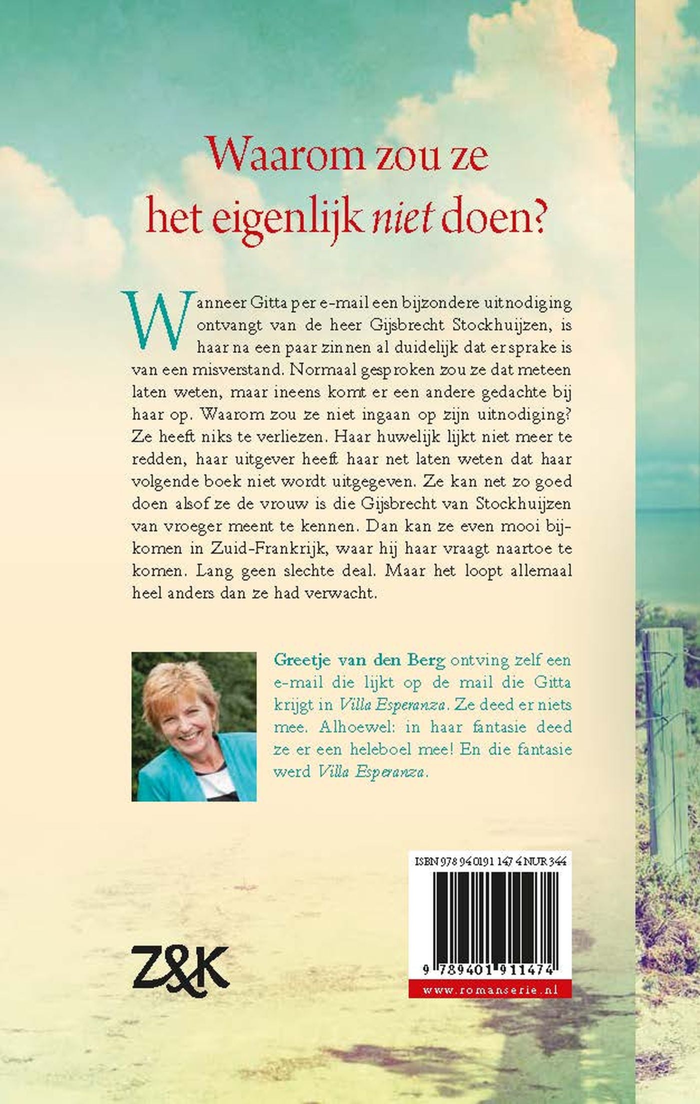 Wanneer Gitta per mail een uitnodiging ontvangt van de heer Gijsbrecht van Stockhuijzen, is het haar meteen duidelijk dat er sprake is van een misverstand. Normaal gesproken zou ze dat laten weten, maar ineens komt er een andere gedachte bij haar op. Dat is het begin van ‘Villa Esperanza’ van Greetje van den Berg. Want waarom zou Gitta niet ingaan op zijn uitnodiging? Ze wil wel naar Zuid-Frankrijk, ook als ze daarvoor moet doen alsof zij de vrouw is die Gijsbrecht van Stockhuijzen van vroeger kent… ‘Villa Esperanza’ van Greetje van den Berg is een boek om van te smullen.