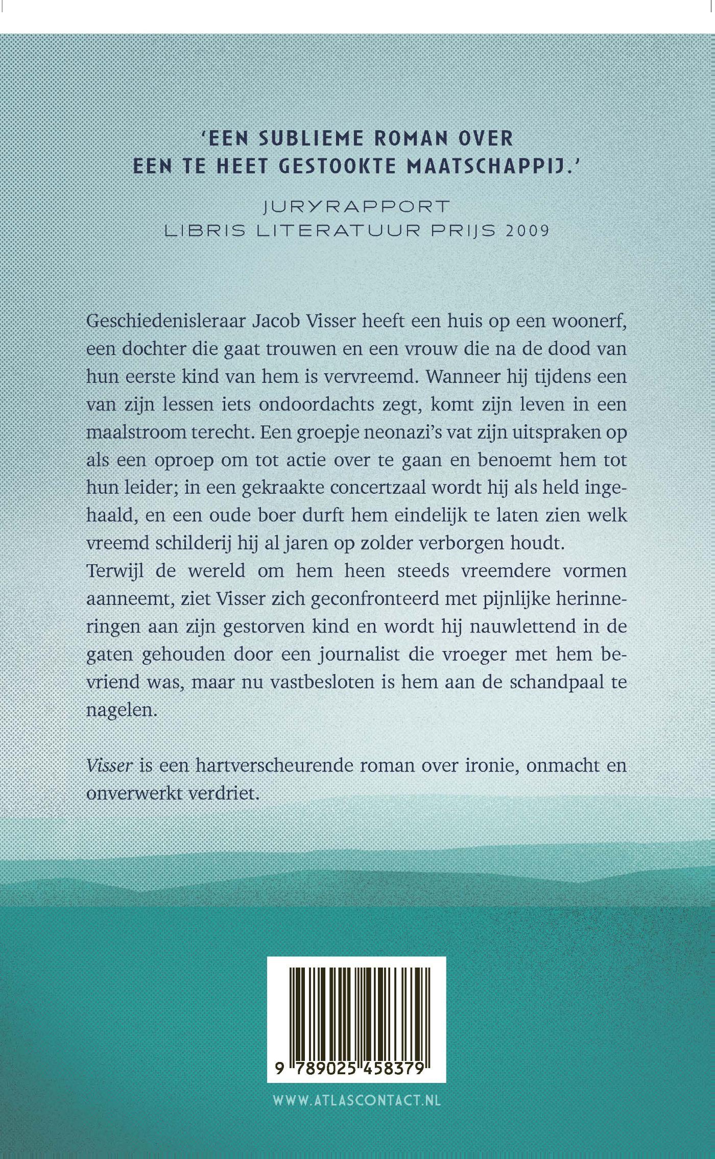 ‘Visser’ van Rob van Essen is een hartverscheurende roman over ironie, onmacht en onverwerkt verdriet. Geschiedenisleraar Jacob Visser heeft een huis op een woonerf, een dochter die gaat trouwen en een vrouw die van hem is vervreemd. Wanneer hij tijdens een van zijn lessen iets ondoordachts zegt, komt zijn leven in een maalstroom terecht. Een groepje neonazi’s vat zijn uitspraken op als een oproep om tot actie over te gaan en benoemt hem tot hun leider. Terwijl de wereld om hem heen steeds vreemdere vormen aanneemt, ziet Visser zich geconfronteerd met pijnlijke herinneringen aan zijn gestorven kind en wordt hij nauwlettend in de gaten gehouden door een journalist die vroeger met hem bevriend was, maar nu vastbesloten is hem aan de schandpaal te nagelen.