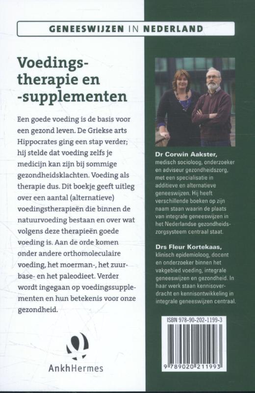 Voedingstherapie en - supplementen is het elfde deel in de nieuwe AnkhHermes-serie Geneeswijzen in Nederland. Eerder verschenen al Natuurgeneeskunde, Kruidengeneeskunde, Chinese geneeskunde, Ayurvedische geneeskunde, Antroposofische geneeskunde, Homeopathie, Lichaam & geest therapieën, Manuele behandelwijzen, Spirituele westerse geneeswijzen en Traditionele niet-westerse geneeswijzen. De serie zal in de zomer van 2016 compleet zijn (12 delen) en omvat de belangrijkste alternatieve geneeswijzen. Er is veel belangstelling voor alternatieve geneeswijzen, en er is ook heel veel over te vinden op internet. Maar hoe weet je of deze informatie betrouwbaar is? AnkhHermes biedt met deze serie de meest up-to-date informatie, op een begrijpelijke manier geschreven door medische professionals. Wegwijs in een uur!