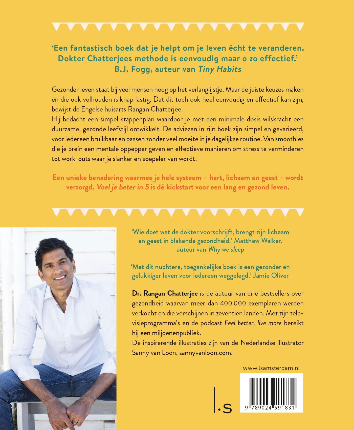 Voel je beter in 5 is dé kickstart voor een lang en gezond leven. Dr. Chatterjee bewijst door middel van simpele tips en adviezen hoe eenvoudig een gezond leven kan zijn en hoe gemakkelijk het in te passen is in je dagelijkse routine.