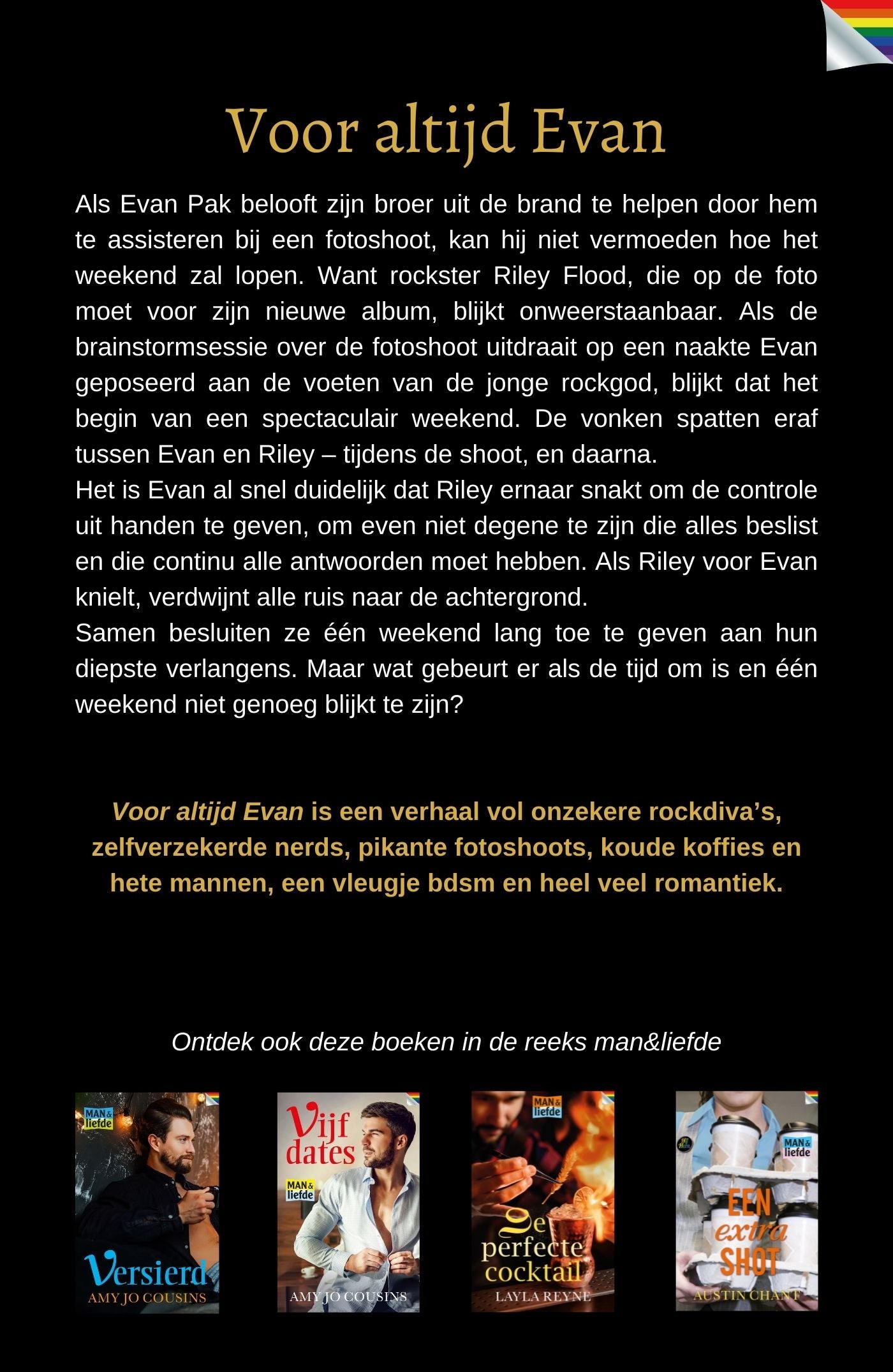 ‘Voor altijd Evan’ is een novelle (ca. 30.000 woorden/90 blz.) bedoeld voor een volwassen publiek met expliciete scènes. Een verhaal vol onzekere rockdiva’s, zelfverzekerde nerds, pikante fotoshoots, koude koffies en hete mannen, een vleugje bdsm en een flinke portie romantiek.