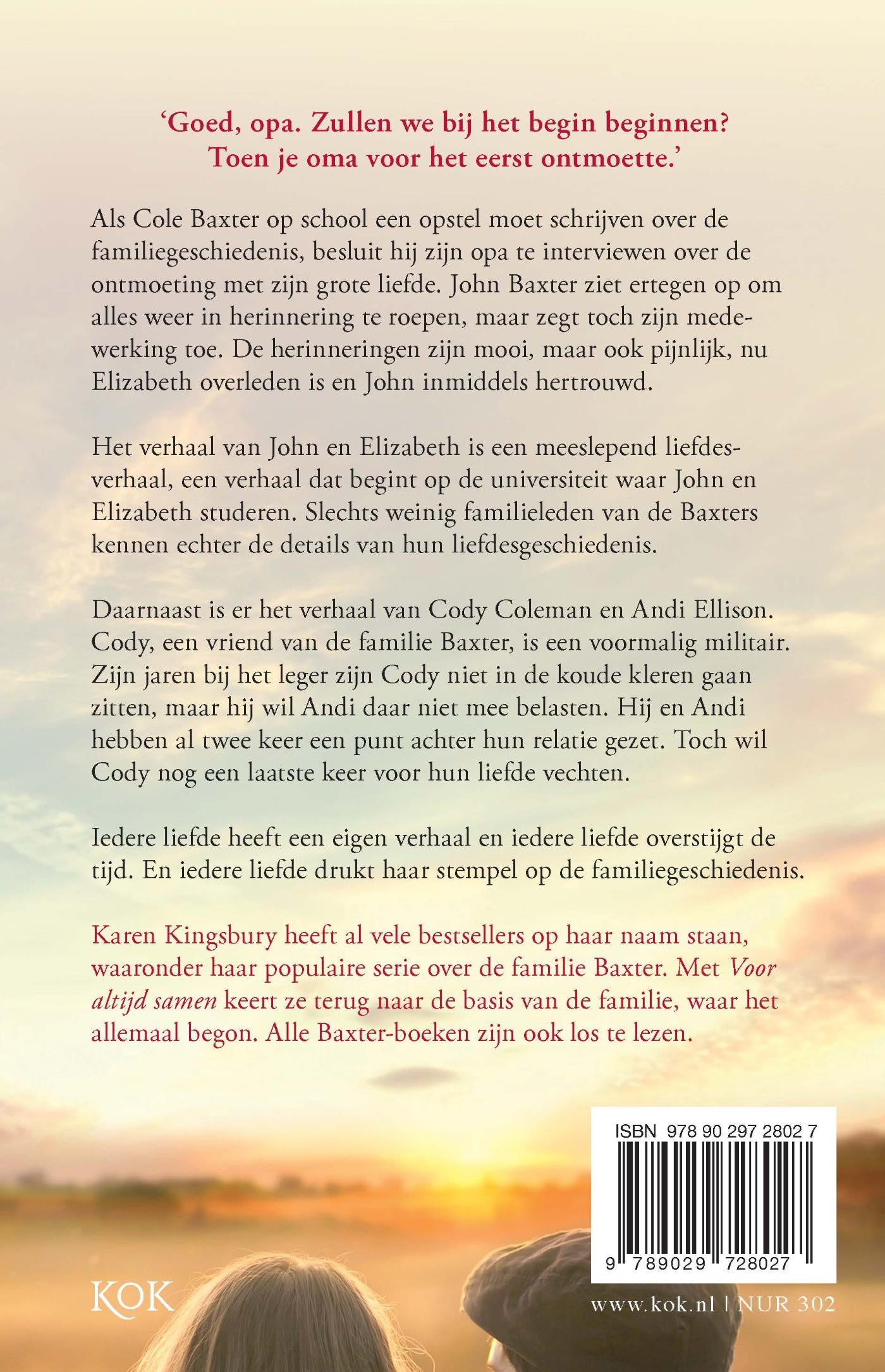 ‘Voor altijd samen’ van Karen Kingsbury vertelt het liefdesverhaal van John en Elizabeth Baxter, die letterlijk aan de wieg stonden van de beroemde fictionele familie Baxter.
