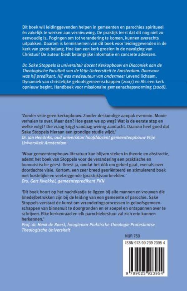 Dit boek wil leidinggevenden helpen in gemeenten en parochies spiritueel én zakelijk te werken aan vernieuwing. De praktijk leert dat dit nog niet zo eenvoudig is. Pogingen om tot verandering te komen, kunnen averechts uitpakken. Daarom is kennisnemen van dit boek voor leidinggevenden in de kerk van groot belang. Hoe kan een kerk groeien in de navolging van Christus? De auteur biedt belangrijke informatie en concrete adviezen.