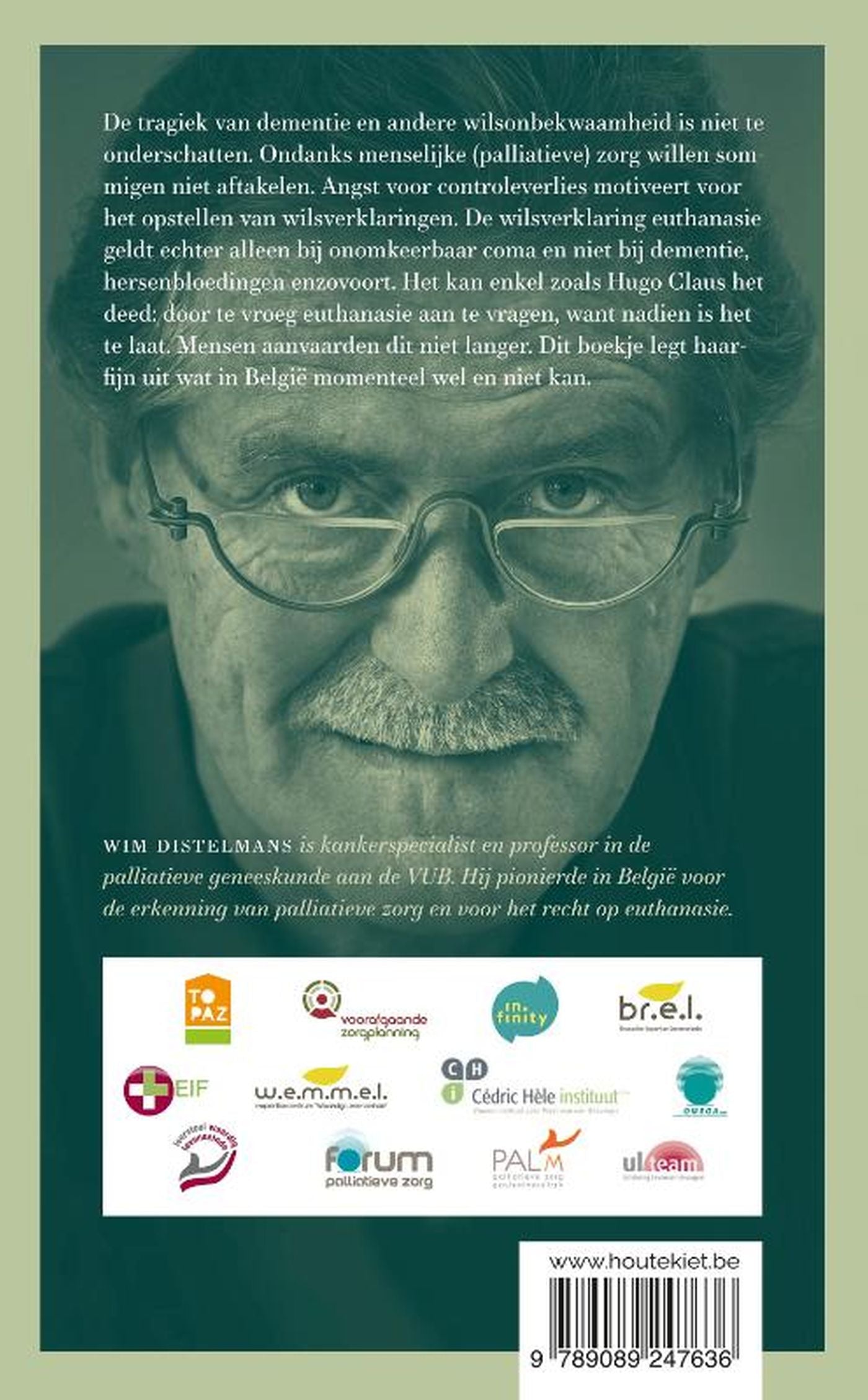 De tragiek van dementie en andere wilsonbekwaamheid is niet te onderschatten. Ondanks menselijke (palliatieve) zorg willen sommigen niet aftakelen. Angst voor controleverlies motiveert voor het opstellen van wilsverklaringen. De wilsverklaring euthanasie geldt echter alleen bij onomkeerbaar coma en niet bij dementie, hersenbloedingen enzovoort. Het kan enkel zoals Hugo Claus het deed: door te vroeg euthanasie aan te vragen, want nadien is het te laat. Mensen aanvaarden dit niet langer. Dit boekje legt haarfijn uit wat in België momenteel wel en niet kan.