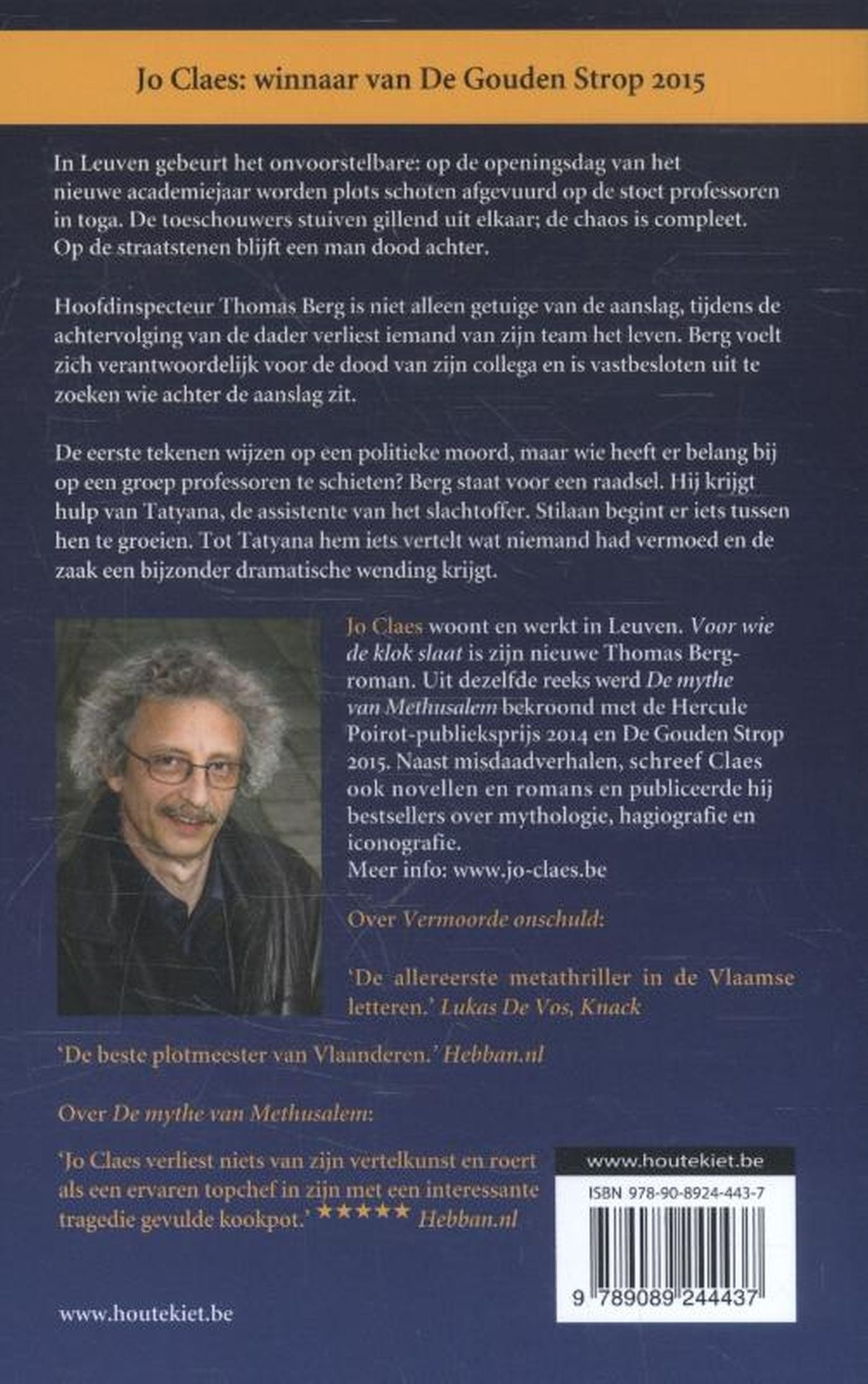 Jo Claes woont en werkt in Leuven. Voor wie de klok slaat is zijn nieuwe Thomas Berg-roman. Uit dezelfde reeks werd De mythe van Methusalem bekroond met de Hercule Poirot-publieksprijs 2014 en De Gouden Strop 2015. Naast misdaadverhalen, schreef Claes ook novellen en romans en publiceerde hij bestsellers over mythologie, hagiografie en iconografie. Meer info: www.jo-claes.be
