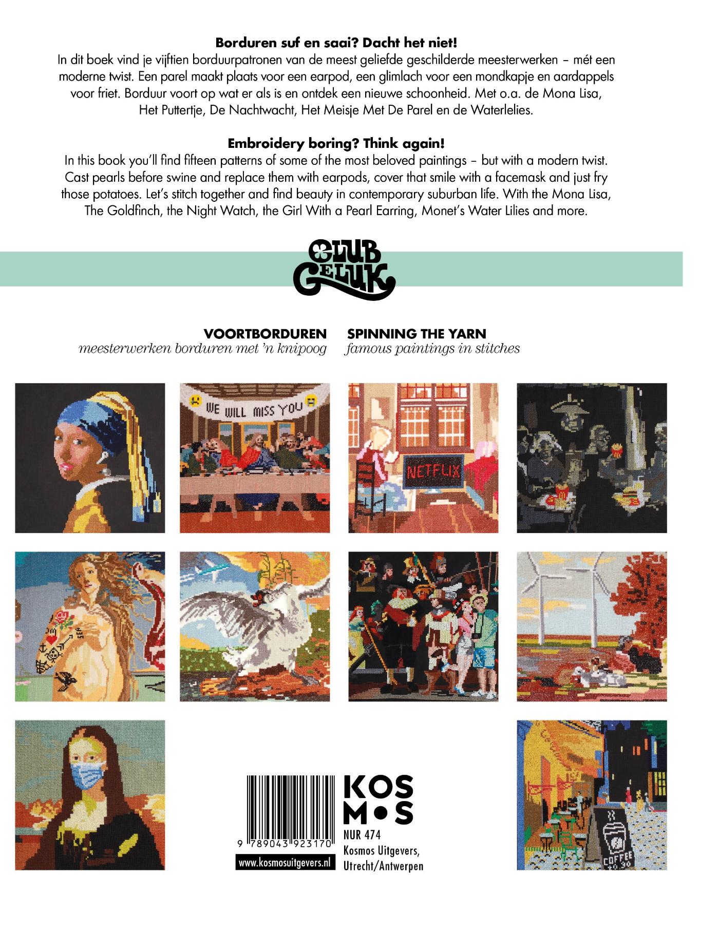Borduren suf en saai? Echt niet! In dit schitterende boek staan borduurpatronen van de meest geliefde en bekende geschilderde meesterwerken – met een moderne twist. Borduur aan de hand van gedetailleerde patronen nu zelf de Nachtwacht van Rembrandt en borduur dan voort: voeg toeristen en selfiesticks toe. Of het beroemde schilderij De aardappeleters van Van Gogh met friet op tafel. Dit unieke boek is een must voor iedereen die van handwerken houdt en echt iets bijzonders wil maken. Met o.a. de Mona Lisa, Het puttertje, de Nachtwacht, Meisje met de parel, de Waterlelies van Monet, de Venus van Milo en nog veel meer.