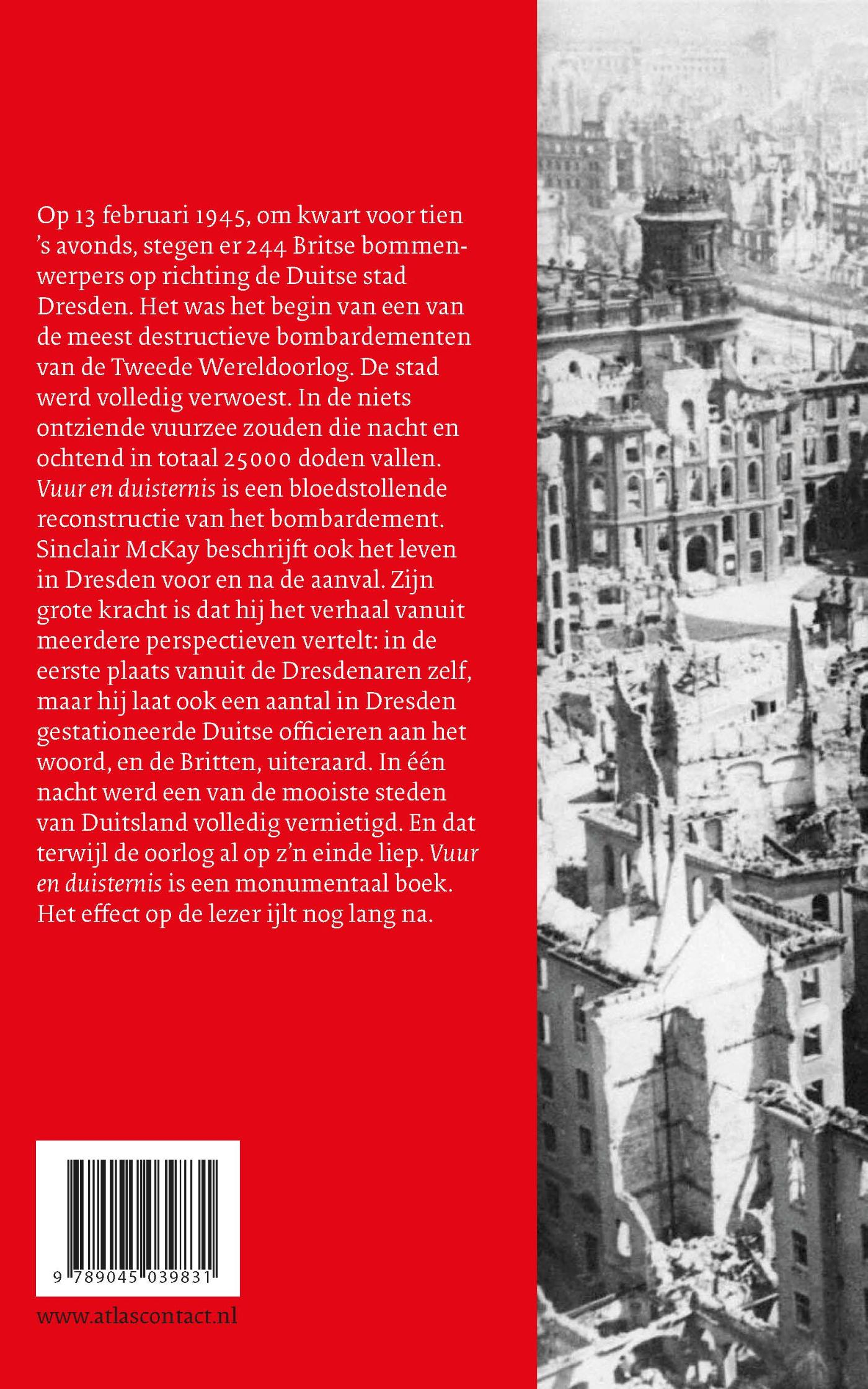 Vuur en duisternis van Sinclair Mckay is een bloedstollende reconstructie van het bombardement op Dresden. Op 13 februari 1945, om kwart voor tien ’s avonds, stegen er 244 Britse bommenwerpers op richting de Duitse stad. Het was het begin van een van de meest destructieve bombardementen van de Tweede Wereldoorlog. De stad werd volledig verwoest. In de nietsontziende vuurzee zouden die nacht en ochtend in totaal 25 000 doden vallen. McKay beschrijft ook het leven in Dresden voor en na de aanval. Zijn grote kracht is dat hij het verhaal vanuit meerdere perspectieven vertelt: in de eerste plaats vanuit de Dresdenaren zelf, maar hij laat ook een aantal in Dresden gestationeerde Duitse officieren aan het woord, en de Britten, uiteraard. In één nacht werd een van de mooiste steden van Duitsland volledig vernietigd. En dat terwijl de oorlog al op z’n einde liep. Vuur en duisternis is een monumentaal boek. Het effect op de lezer ijlt nog lang na.