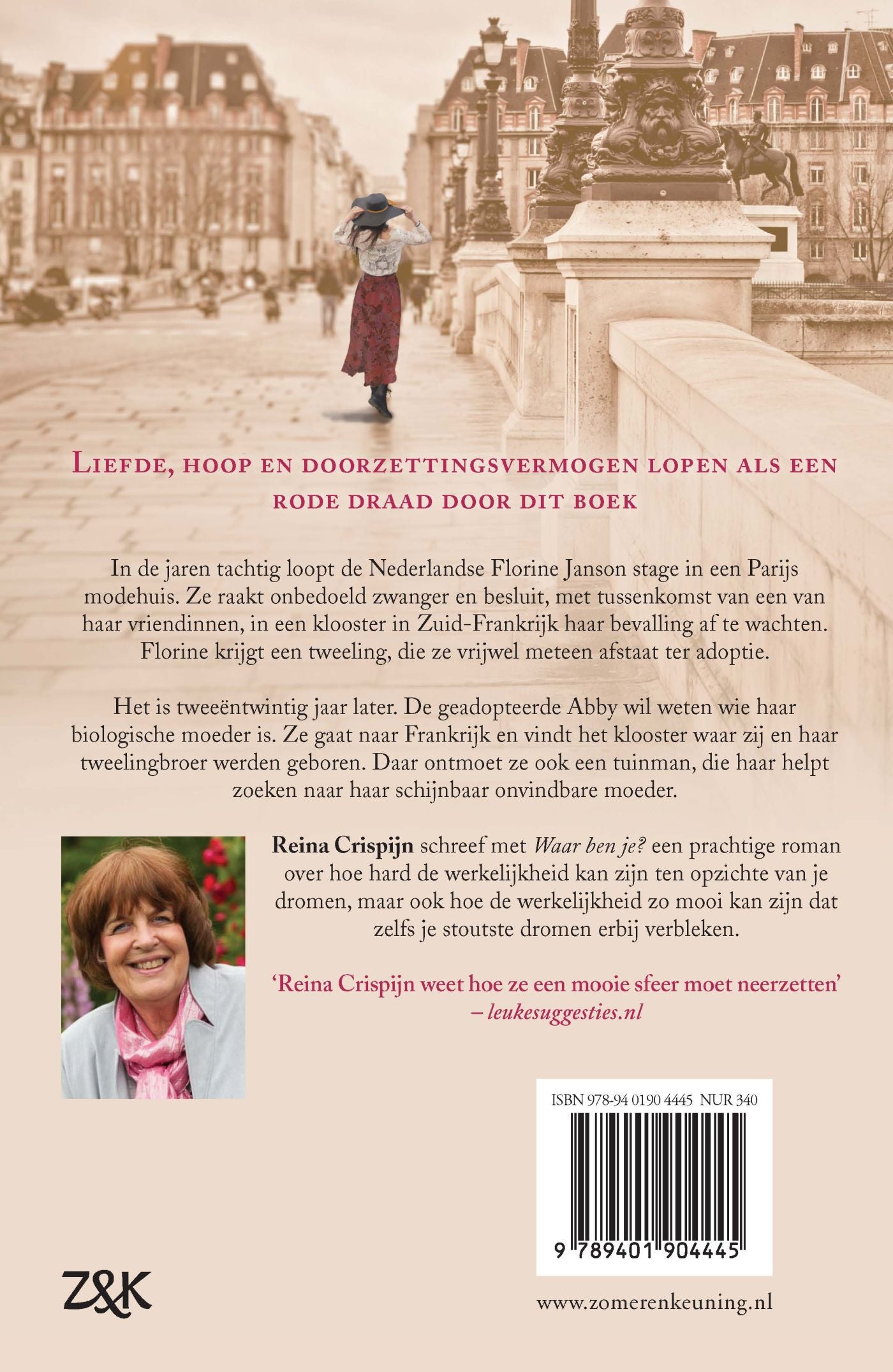 Reina Crispijn brengt met Waar ben je? Een feelgoodverhaal over de Parijse mode-industrie, dromen en werkelijkheid, romantiek en familie. De auteur is bekend van de boeken Dochter van de maan en Dochter van de sterren, en van haar werk samen met zus Margreet.