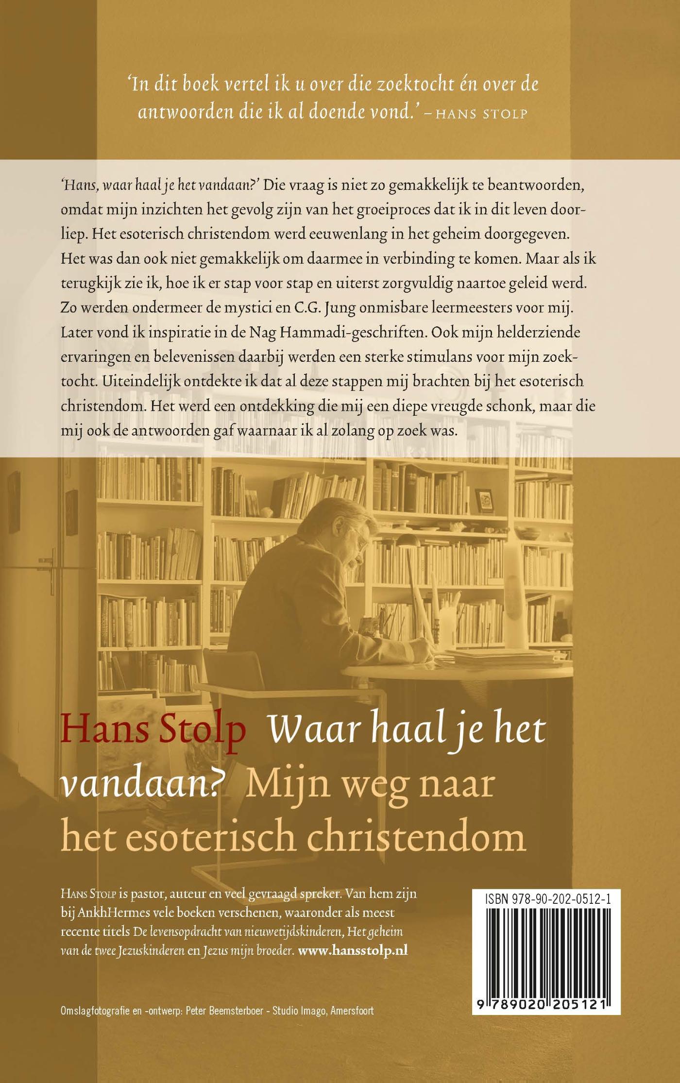 Hans, waar haal je het vandaan?’ Die vraag is niet zo gemakkelijk te beantwoorden, omdat mijn inzichten het gevolg zijn van het groeiproces dat ik in dit leven doorliep. Het esoterisch christendom werd eeuwenlang in het geheim doorgegeven. Het was dan ook niet gemakkelijk om daarmee in verbinding te komen. Maar als ik terugkijk, zie ik hoe ik er stap voor stap en uiterst zorgvuldig naartoe geleid werd. Zo werden ondermeer de mystici en C.G. Jung onmisbare leermeesters voor mij. Later vond ik inspiratie in de Nag Hammadi-geschriften. Ook mijn helderziende ervaringen en belevenissen daarbij werden een sterke stimulans voor mijn zoektocht. Uiteindelijk ontdekte ik dat al deze stappen mij brachten bij het esoterisch christendom. Het werd een ontdekking die mij een diepe vreugde schonk, maar die mij ook de antwoorden gaf waarnaar ik al zolang op zoek was. ‘In dit boek vertel ik u over die zoektocht én over de antwoorden die ik al doende vond.’ – Hans Stolp