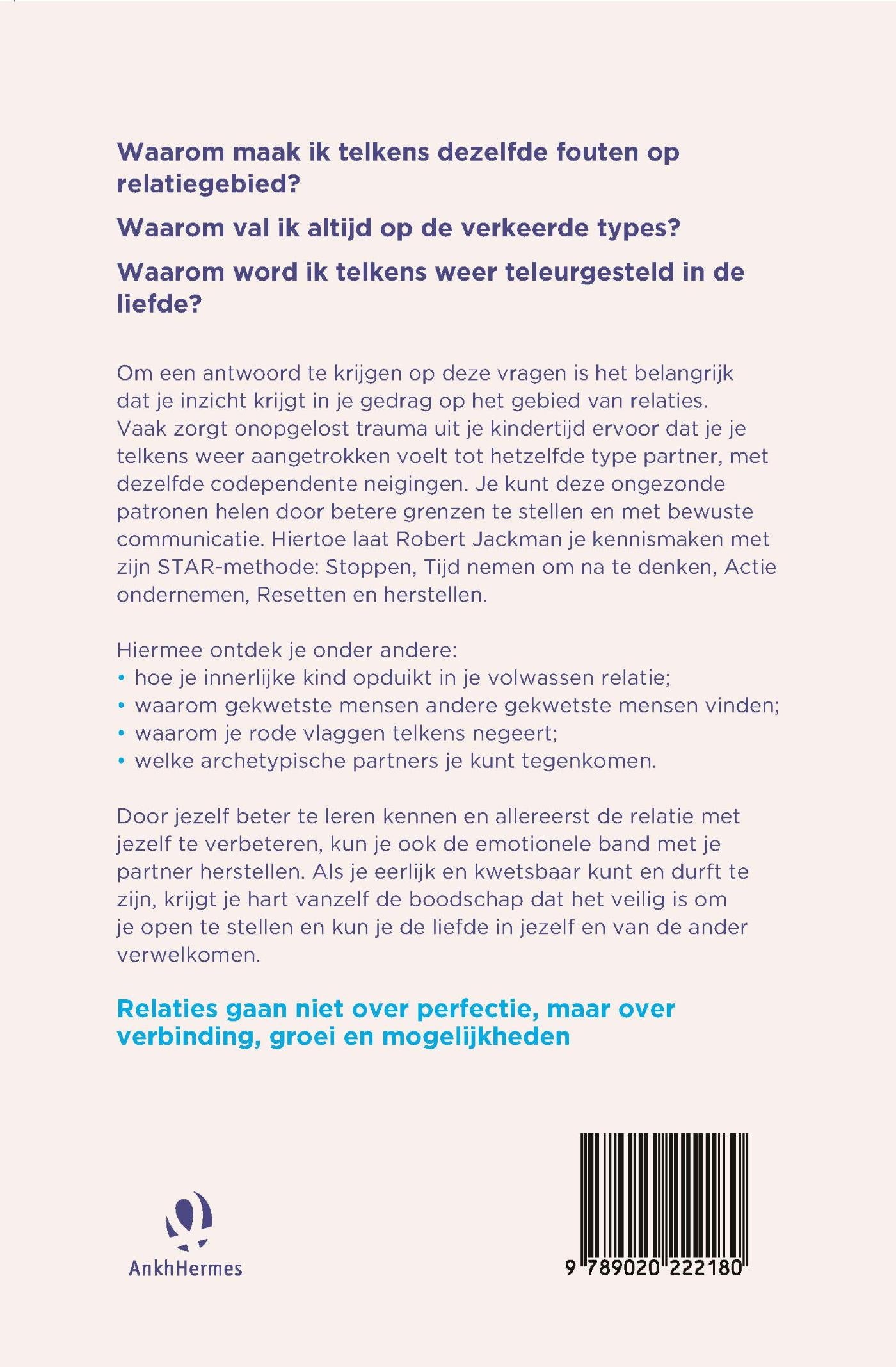 Je kunt deze ongezonde patronen helen door het stellen van betere grenzen en het toepassen van bewuste communicatie. Hiertoe laat Robert Jackman je kennismaken met zijn Star-methode: Stoppen, Tijd nemen om na te denken, Actie ondernemen, Resetten en herstellen. Door jezelf beter te leren kennen en allereerst de relatie met jezelf te verbeteren, kun je ook de emotionele band met je partner herstellen.