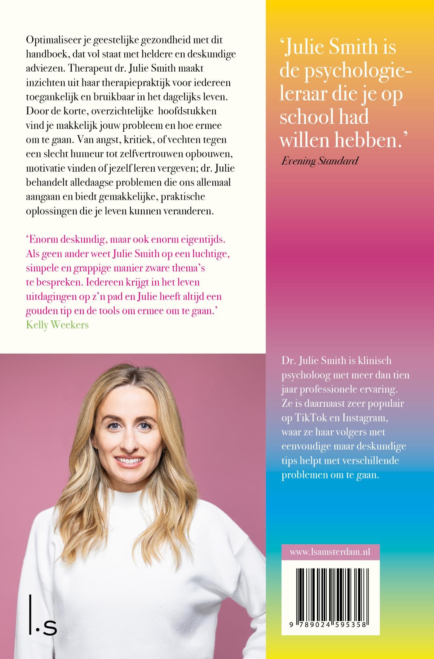Optimaliseer je geestelijke gezondheid met dit onmisbare handboek van TikTok-sensatie Dr. Julie, gevuld met geheimen van een therapeut. Met haar eenvoudige maar deskundige adviezen helpt Julie Smith je met verschillende problemen om te gaan. Door de korte hoofdstukjes kun je makkelijk op zoek naar de juiste copingtechnieken en adviezen voor jouw probleem. Van het omgaan met angst of kritiek, of vechten tegen een slecht humeur, tot het opbouwen van zelfvertrouwen, het vinden van motivatie of leren jezelf te vergeven; dit boek behandelt de alledaagse problemen die ons allemaal aangaan en biedt gemakkelijke, praktische oplossingen die je leven kunnen veranderen.