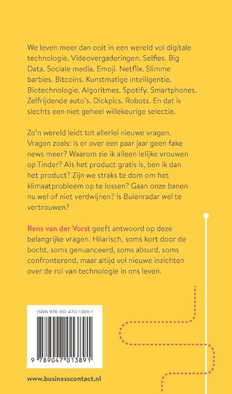 Rens van der Vorst geeft antwoord op deze belangrijke vragen. Hilarisch, soms kort door de bocht, soms genuanceerd; soms absurd, soms confronterend; maar altijd vol nieuwe inzichten over de rol van technologie in ons leven.