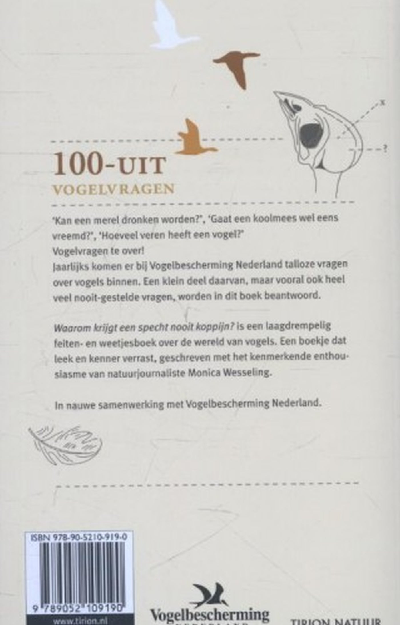 ‘Kan een merel dronken worden?’, ‘Gaat een koolmees wel eens vreemd?’, ‘Hoeveel veren heeft een vogel?’ Vogelvragen te over! Jaarlijks komen er bij Vogelbescherming Nederland honderden vragen binnen over verschillende vogelsoorten. Een deel van die vragen en vooral veel nooit-gestelde vragen worden in dit boek beantwoord. Waarom krijgt een specht geen koppijn? is een laagdrempelig feiten- en weetjesboek over de wereld van vogels.