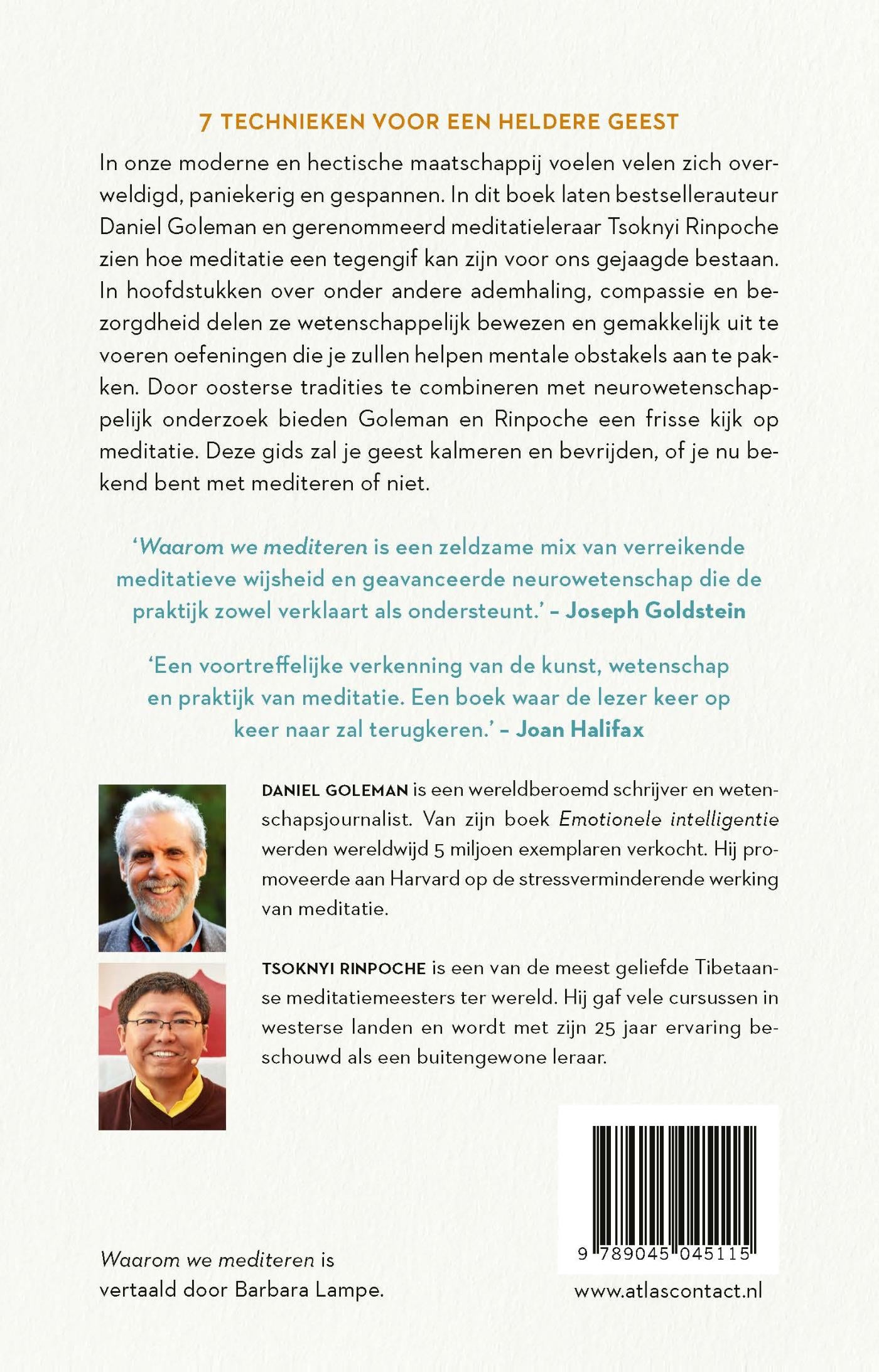 In Waarom we mediteren laten bestsellerauteur Daniel Goleman en gerenommeerd meditatieleraar Tsoknyi Rinpoche zien hoe meditatie een tegengif kan zijn voor ons gejaagde bestaan. In onze moderne en hectische maatschappij voelen velen zich overweldigd, paniekerig en gespannen. In hoofdstukken over onder andere ademhaling, compassie en bezorgdheid delen ze wetenschappelijk bewezen en gemakkelijk uit te voeren oefeningen die je zullen helpen mentale obstakels aan te pakken. Door oosterse tradities te combineren met neurowetenschappelijk onderzoek bieden Goleman en Rinpoche een frisse kijk op meditatie. Deze gids zal je geest kalmeren en bevrijden, of je nu bekend bent met mediteren of niet.