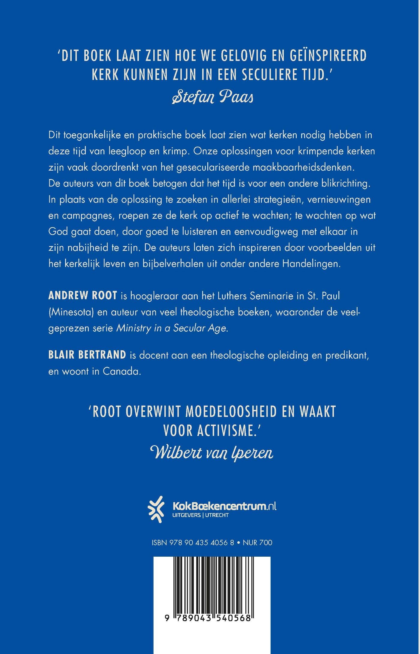 Wachten op God van hoogleraar theologie Andrew Root en docent theologie Blair Bertrand zet in toegankelijke taal uiteen wat kerken nodig hebben in deze tijd van leegloop en krimp. Daarbij nemen ze afstand van het maakbaarheidsdenken. In plaats van de oplossing te zoeken in allerlei strategieën, vernieuwingen en campagnes, roepen ze de kerk op te wachten: wachten op wat God gaat doen. Ze geven aan dat onze oplossingen voor krimpende kerken zijn doordrenkt van het geseculariseerde denken. Het is tijd voor een andere blikrichting. De auteurs laten zich inspireren door voorbeelden uit het kerkelijk leven en Bijbelverhalen uit onder andere Handelingen.