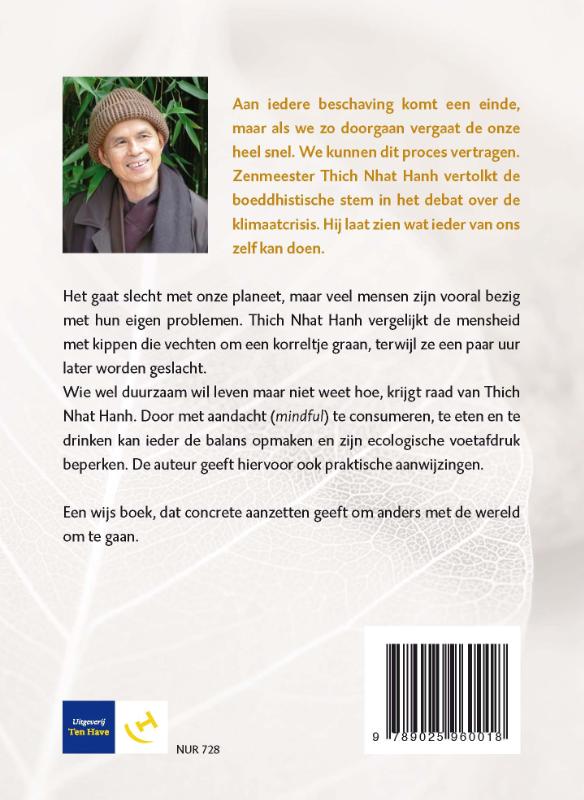 De meeste mensen willen wel op een duurzame manier leven, maar weten niet hoe. Thich Nhat Hanh geeft een aanzet: door met aandacht (mindful) te consumeren, te eten en te drinken kan ieder individu de balans opmaken en zijn ecologische voetafdruk beperken. De auteur geeft hiervoor ook praktische aanwijzingen.