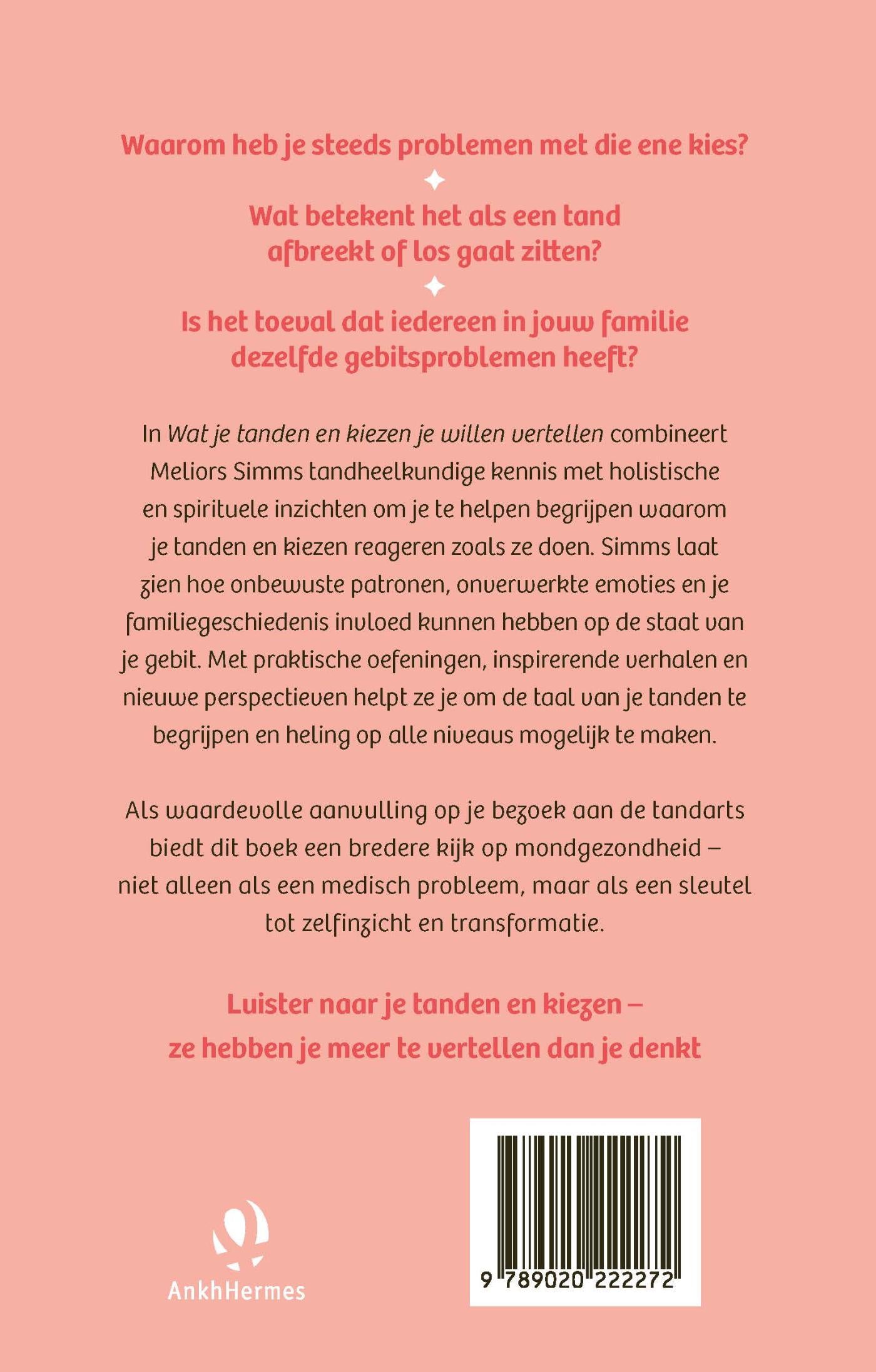 'Wat je tanden en kiezen je willen vertellen' van Meliors Simms biedt een verfrissende, holistische kijk op mondgezondheid. Dat emoties invloed hebben op je lichamelijke gezondheid is algemeen bekend. Maar wist je dat ze ook van invloed zijn op je gebit? En dat je veel meer kunt doen aan je mondgezondheid dan alleen ieder half jaar naar de tandarts gaan, flossen en niet te veel suiker eten? Ook zeggen een scheefstaande tand, een gaatje in een kies of terugtrekkend tandvlees meer over je mentale en fysieke gezondheid dan je in eerste instantie zou denken.