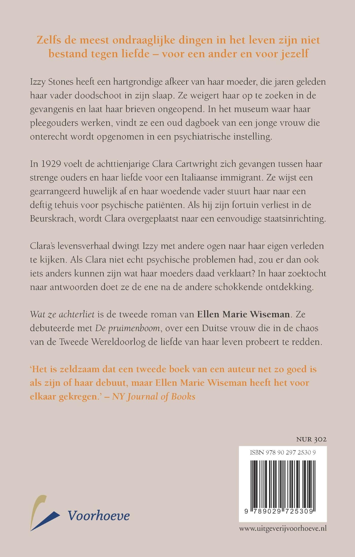 Voor de liefhebbers van Kristin Hannah en Jenna Blum: ‘Wat ze achterliet’ van Ellen Marie Wiseman is een ontroerende roman over een moeder die zich opoffert voor haar dochter. Tien jaar geleden schoot Izzy Stones moeder haar vader dood in zijn slaap. De inmiddels zeventienjarige Izzy weigert haar moeder op te zoeken in de gevangenis en laat haar brieven ongeopend. Haar pleegouders werken in een lokaal museum en vragen haar hulp bij het catalogiseren van voorwerpen die gevonden zijn op de zolder van een al lang geleden gesloten staatsinrichting. Daar, te midden van stapels achtergelaten bezittingen, vindt Izzy een oud dagboek.