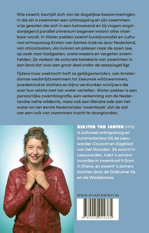 Wie zwemt, bevrijdt zich van de dagelijkse beslommeringen. In die zin is zwemmen een ontsnapping en zijn zwemmers vrije geesten die zich in een betoverend en bij vlagen angstaanjagend parallel universum begeven waarin alles vloeibaar wordt. In Water pakken zwemt kunstjournalist en cultureel antropoloog Kirsten van Santen kriskras door Nederland, van chloorbaden, via rivieren en plassen naar de open zee, op zoek naar badgasten, waterwezens en vergeten zwemhelden. Ze verkent de culturele betekenis van zwemmen in een land dat voor een groot deel onder de zeespiegel ligt.