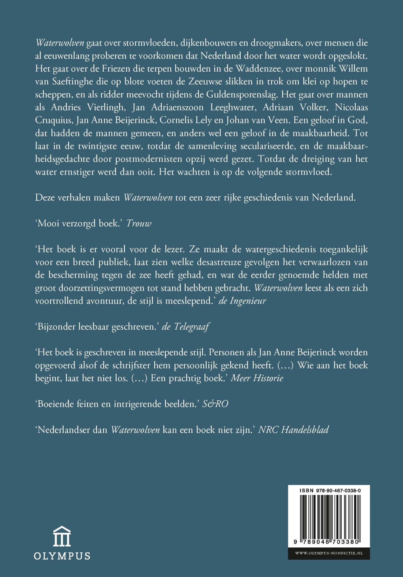 Waterwolven gaat over de Friezen die terpen bouwden in de Waddenzee, over monnik Willem van Saeftinghe die op blote voeten de Zeeuwse slikken in trok om klei op hopen te scheppen, over Andries Vierlingh, Brabants dijkgraaf en vader van zes kinderen, over molenmaker Jan Adriaanszoon Leeghwater, die valse kerkklokken voor de Amsterdamse Zuiderkerk ontwierp, over baggeraar Adriaan Volker, die voortijdig een boottocht met prins Frederik verliet, zodat hij gewoon thuis kon eten.