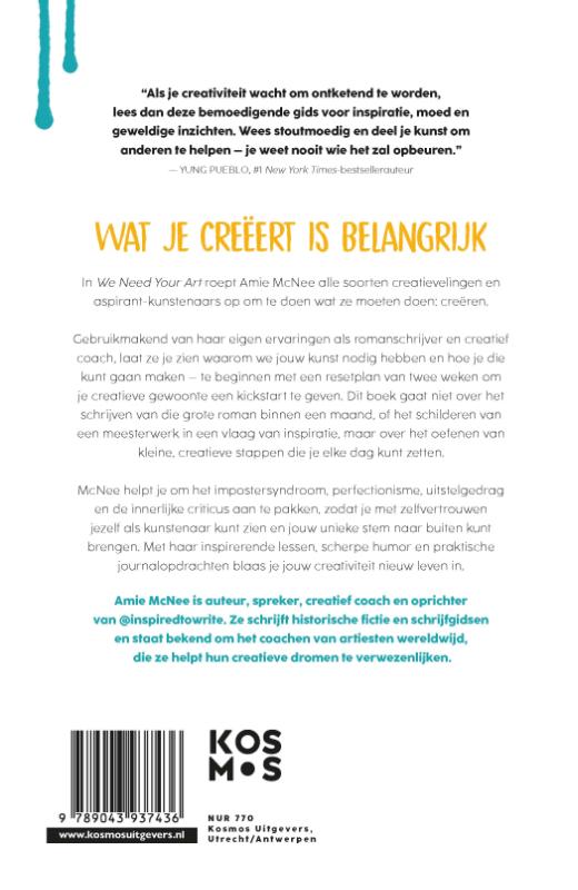 In 'We Need Your Art' inspireert Amie McNee (@inspiredtowrite) creatievelingen om hun artistieke dromen na te jagen, zonder te streven naar perfectie. Dit boek gaat niet om het maken van een meesterwerk in één keer, maar om het ontwikkelen van kleine, duurzame creatieve gewoonten die je dagelijks oefent. McNee helpt je om het imposter-syndroom, perfectionisme, uitstelgedrag en de innerlijke criticus aan te pakken, zodat je met zelfvertrouwen jezelf als kunstenaar kunt zien en jouw unieke stem naar buiten kunt brengen.