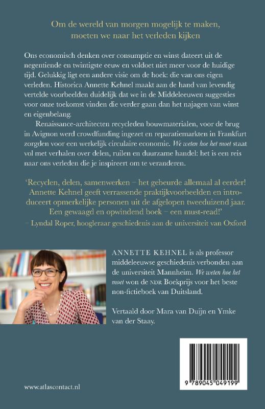 Ons economisch denken over consumptie en winst dateert uit de negentiende en twintigste eeuw en voldoet niet meer voor de huidige tijd. Gelukkig ligt een andere visie om de hoek: die van ons eigen verleden. Historica Annette Kehnel maakt aan de hand van levendig vertelde voorbeelden duidelijk dat we in de Middeleeuwen suggesties voor onze toekomst vinden die verder gaan dan het najagen van winst en eigenbelang. Renaissance-architecten recycleden bouwmaterialen, voor de brug in Avignon werd crowdfunding ingezet en reparatiemarkten in Frankfurt zorgden voor een werkelijk circulaire economie. We weten hoe het moet staat vol met verhalen over delen, ruilen en duurzame handel: het is een reis naar ons verleden die je inspireert om te veranderen.