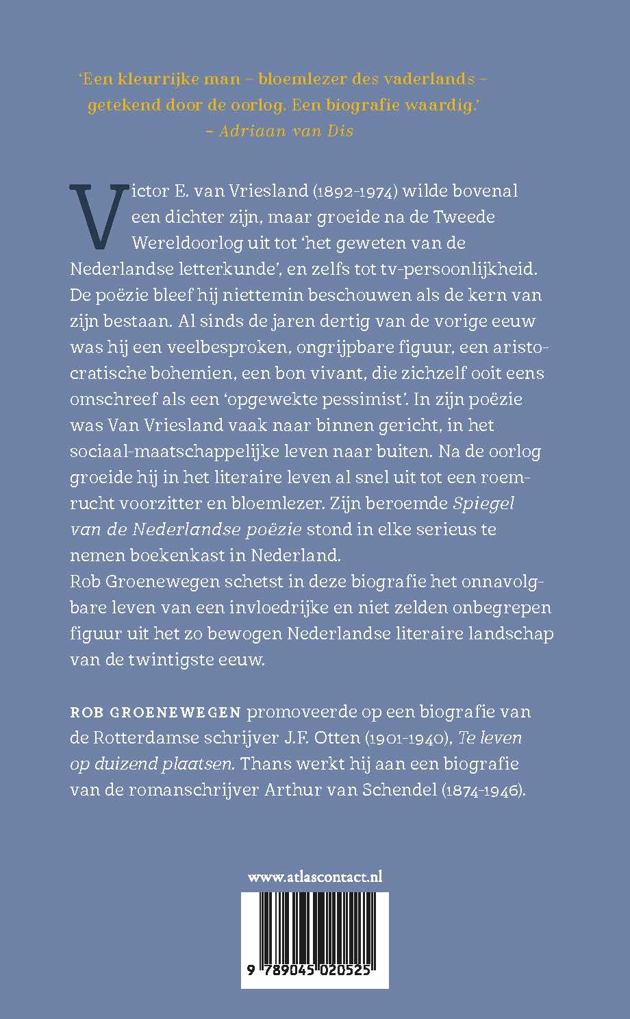 Victor E. van Vriesland (1892-1974) wilde bovenal een dichter zijn, maar groeide na de Tweede Wereldoorlog uit tot ‘het geweten van de Nederlandse letterkunde’, en zelfs tot tv-persoonlijkheid. De poëzie bleef hij niettemin beschouwen als de kern van zijn bestaan. Al sinds de jaren dertig van de vorige eeuw was hij een veelbesproken, ongrijpbare figuur, een aristocratische bohemien, een bon vivant, die zichzelf ooit eens omschreef als een ‘opgewekte pessimist’. In zijn poëzie was Van Vriesland vaak naar binnen gericht, in het sociaal-maatschappelijke leven naar buiten. Na de oorlog groeide hij in het literaire leven al snel uit tot een roemrucht voorzitter en bloemlezer. Zijn beroemde Spiegel van de Nederlandse poëzie stond in elke serieus te nemen boekenkast in Nederland.