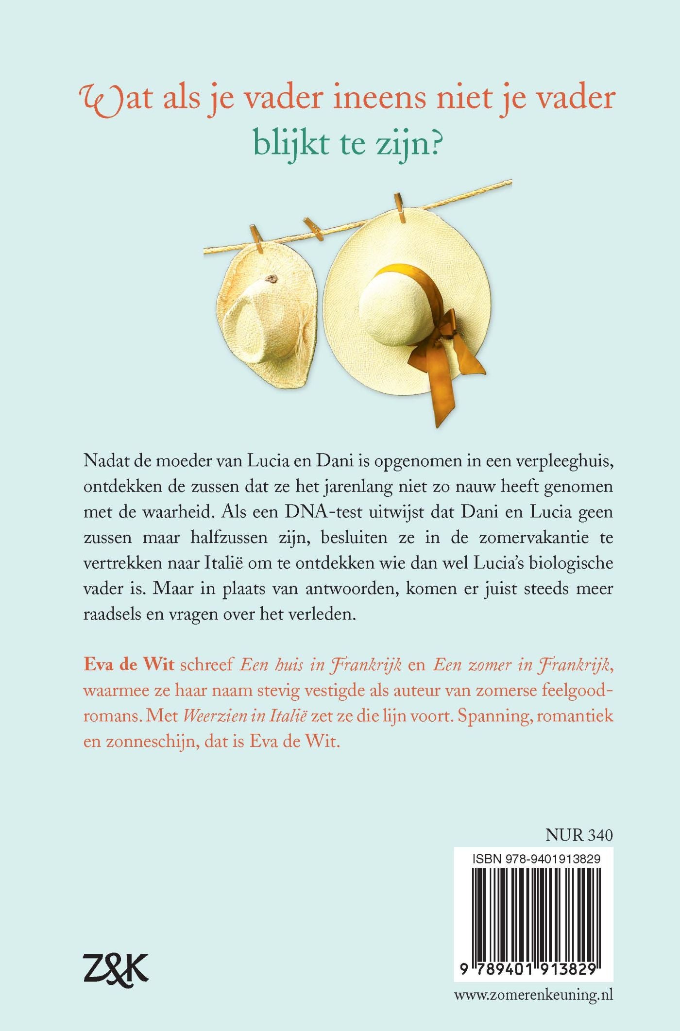 Na twee zomers in Frankrijk neemt Eva de Wit haar lezeressen mee naar Italië met ‘Weerzien in Italië’. Die reis maakt ze aan de hand van de twee zussen Dani en Lucia, die in hun familiegeschiedenis duiken. Eva de Wit ontrafelt langzamerhand het geheim van hun moeder, met veel gevoel voor humor en sfeer. En dat er sfeer is, is evident. Het is tenslotte Italië! ‘Weerzien in Italië’ is een heerlijke opvolger van ‘Een huis in Frankrijk’ en ‘Een zomer in Frankrijk’.