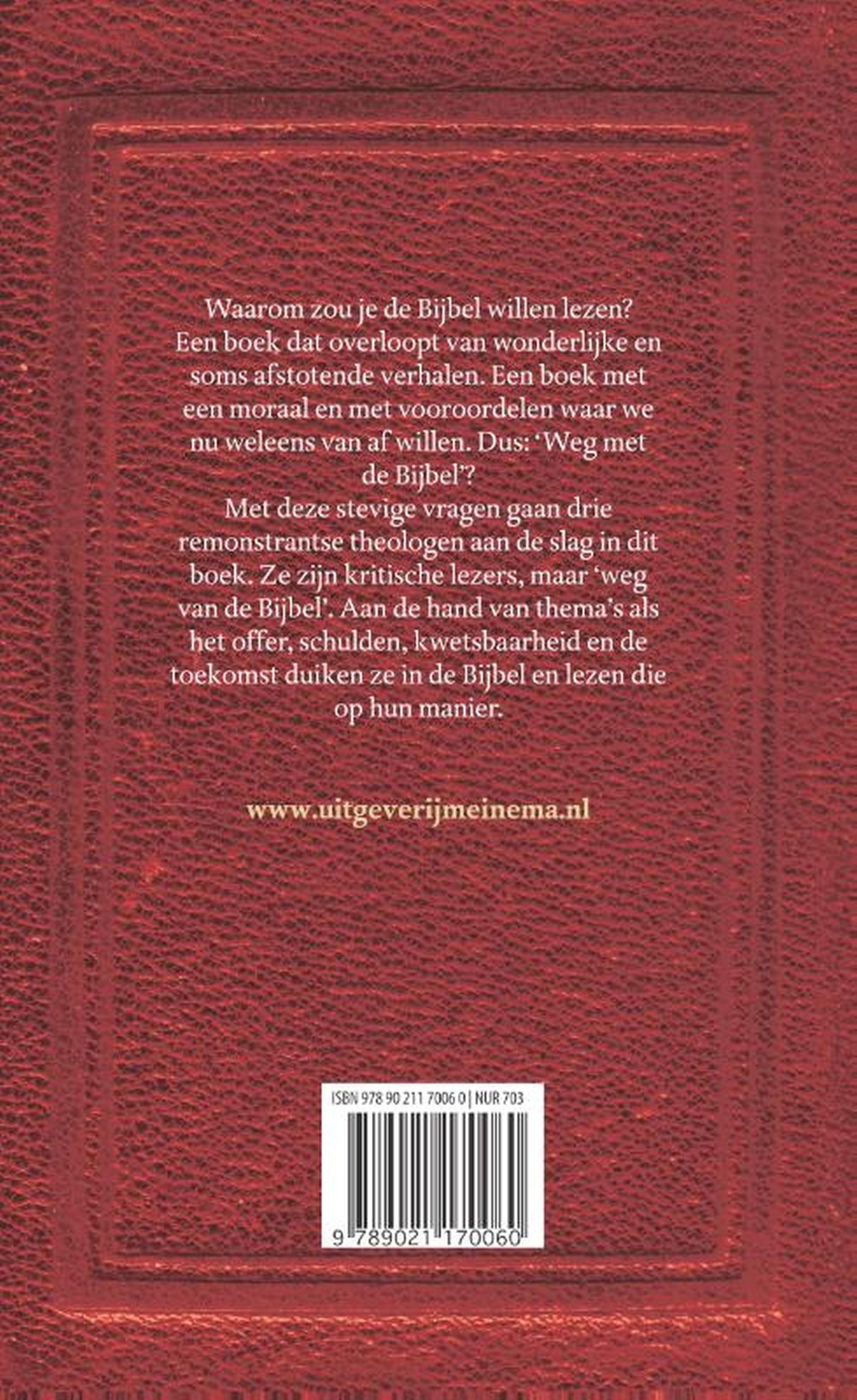 Waarom zou je de Bijbel willen lezen? Een boek dat overloopt van wonderlijke en soms afstotende verhalen. Een boek met een moraal en met vooroordelen waar we nu wel eens van af willen. Dus: 'Weg met de Bijbel'? Met deze stevige vragen gaan drie remonstranten in dit boek aan de slag. Het zijn kritische lezers, maar 'weg van de bijbel'. Aan de hand van thema's als het offer, schulden, kwetsbaarheid en de toekomst duiken ze in de Bijbel en lezen ze die op hun, vrijzinnige manier.