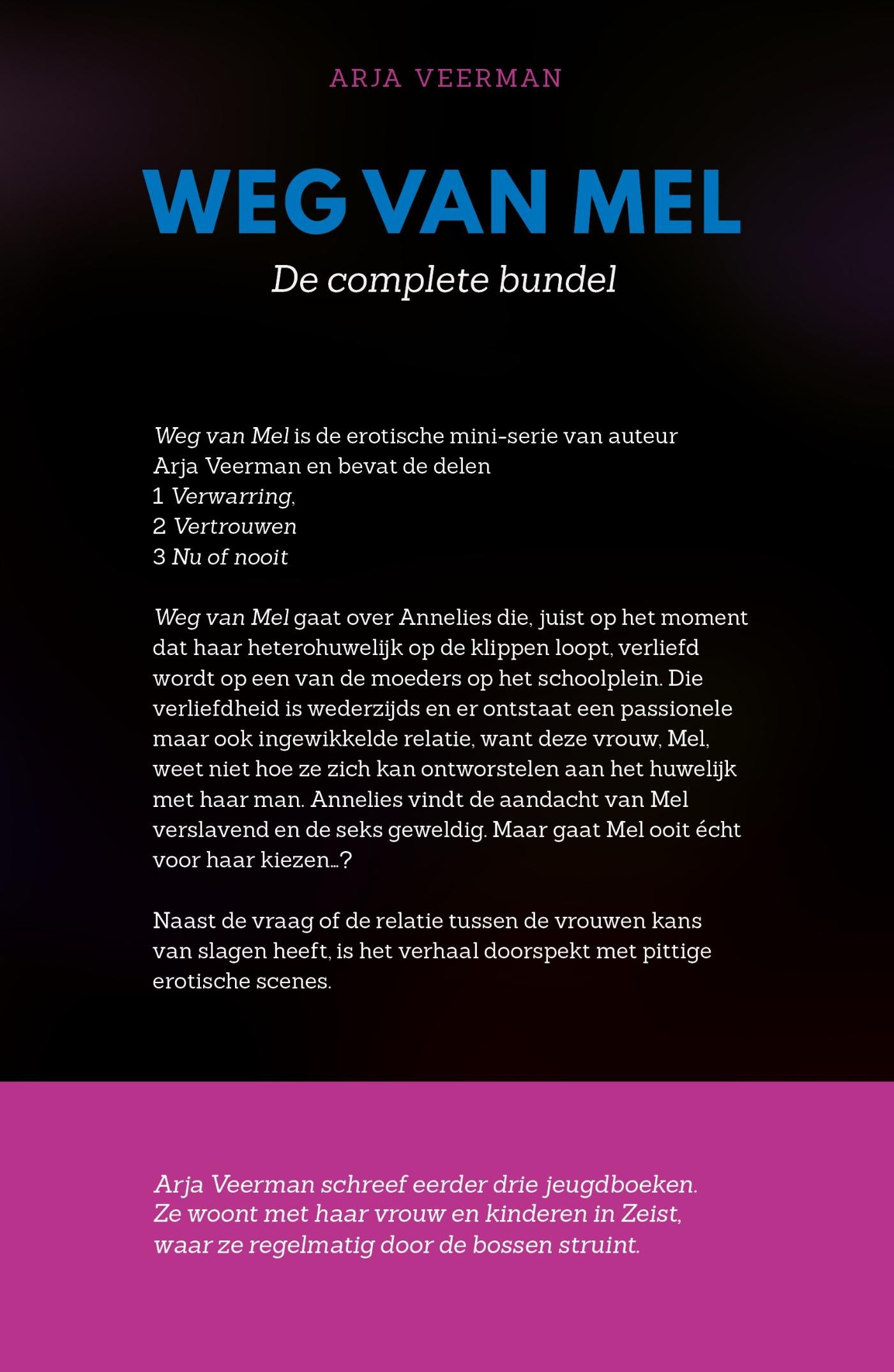 'Weg van Mel'is de verzameling van de driedelig erotische serie van auteur Arja Veerman en bevat de delen 1 'Verwarring', 2 'Vertrouwen' en 3 'Nu of nooit'.