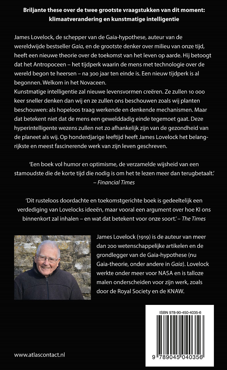 James Lovelock komt in Novaceen met een nieuwe theorie over de toekomst van het leven op aarde. Lovelock, de schepper van de Gaia-hypothese, auteur van de wereldwijde bestseller Gaia, en de grootste denker over milieu van onze tijd, betoogt dat het Antropoceen – het tijdperk waarin de mens met technologie over de wereld begon te heersen – na 300 jaar ten einde is. Een nieuw tijdperk is al begonnen. Welkom in het Novaceen. Kunstmatige intelligentie zal nieuwe levensvormen creëren. Ze zullen 10 000 keer sneller denken dan wij en ze zullen ons beschouwen zoals wij planten beschouwen: als hopeloos traag werkende en denkende mechanismen. Maar dat betekent niet dat de mens een gewelddadig einde tegemoet gaat. Deze hyperintelligente wezens zullen net zo afhankelijk zijn van de gezondheid van de planeet als wij. Op honderdjarige leeftijd heeft James Lovelock het belangrijkste en meest fascinerende werk van zijn leven geschreven.