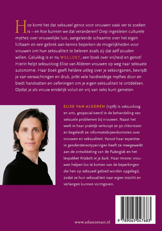 Hoe komt het dat seksueel genot voor vrouwen vaak ver te zoeken is – en hoe kunnen we dat veranderen? Diep ingesleten culturele mythes over vrouwelijke lust, aangeleerde schaamte over het eigen lichaam en een gebrek aan kennis beperken de mogelijkheden voor vrouwen om hun seksualiteit te beleven zoals zij dat zelf zouden willen. Gelukkig is er nu Wellust, een boek over vrijheid en genot! Hierin helpt seksuoloog Elise van Alderen vrouwen op weg naar seksuele autonomie. Haar boek geeft heldere uitleg over je seksorganen, bevrijdt je van verwachtingen en druk, prikt vele hardnekkige mythes door en biedt handvatten en oefeningen om je eigen seksualiteit te ontdekken. Zo kun je als vrouw eindelijk voluit en vrij van seks genieten.