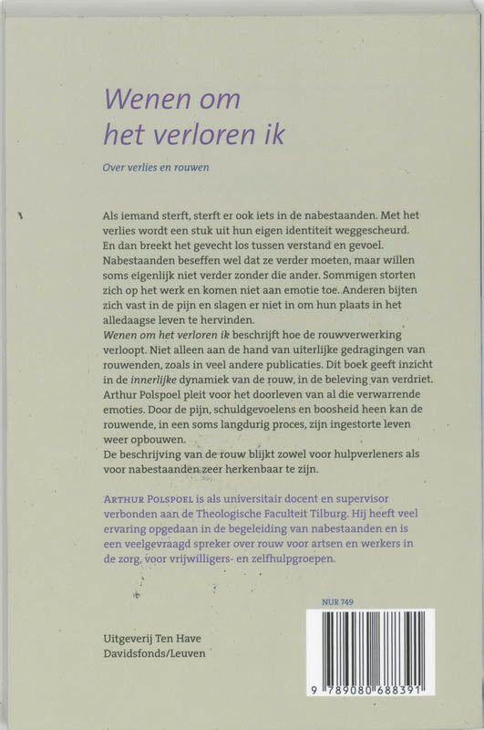 Wenen om het verloren ik beschrijft hoe de rouwverwerking verloopt. Niet alleen aan de hand van uiterlijke gedragingen van rouwenden, zoals in veel andere publicaties. Dit boek geeft inzicht in de innerlijke dynamiek van de rouw, in de beleving van verdriet. Arthur Polspoel pleit voor het doorleven van al die verwarrende emoties. Door de pijn, schuldgevoelens en boosheid heen kan de rouwende, in een soms langdurig proces, zijn ingestorte leven weer opbouwen.