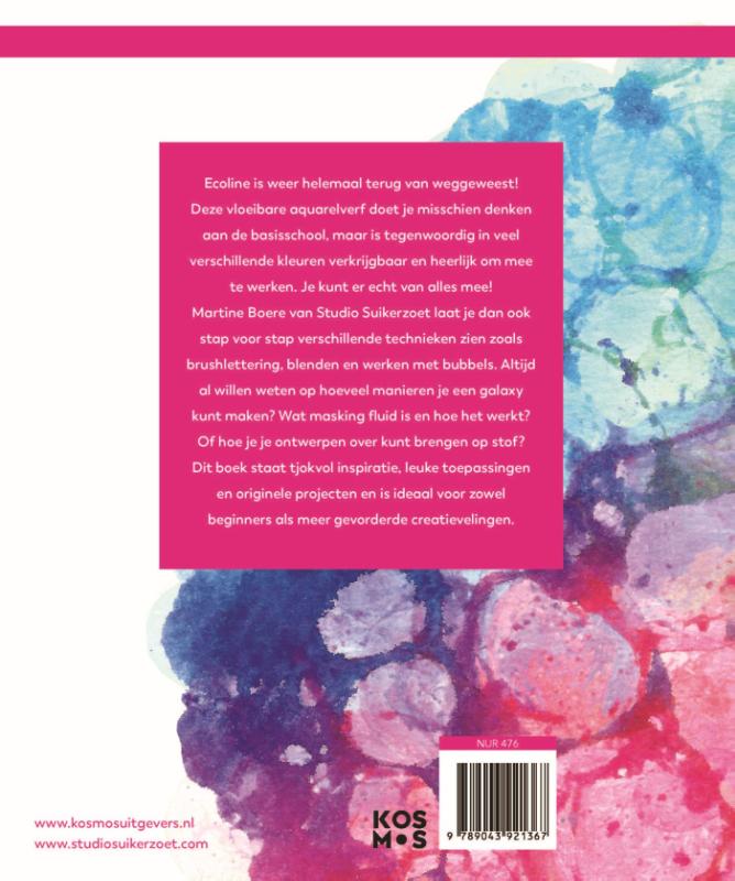 Martine Boere van Studio Suikerzoet laat je dan ook stap voor stap verschillende technieken zien zoals brushlettering, blenden en werken met bubbels. Altijd al willen weten op hoeveel manieren je een galaxy kunt maken? Wat masking fluid is en hoe het werkt? Of hoe je je ontwerpen over kunt brengen op stof? Dit boek staat tjokvol inspiratie, leuke toepassingen en originele projecten en is ideaal voor zowel beginners als meer gevorderde creatievelingen.