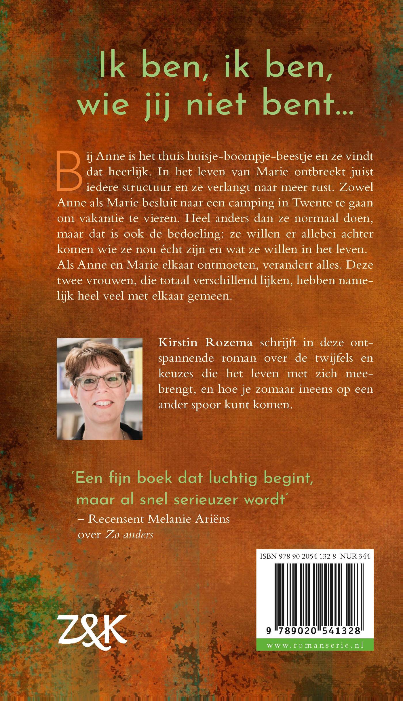 Bij Anne is het thuis huisje-boompje-beestje en ze vindt dat heerlijk. In het leven van Marie ontbreekt juist iedere structuur en ze verlangt naar meer rust. Zowel Anne als Marie besluit naar een camping in Twente te gaan om vakantie te vieren. Heel anders dan ze normaal doen, maar dat is ook de bedoeling: ze willen er allebei achter komen wie ze nou écht zijn en wat ze willen in het leven. Als ze elkaar ontmoeten, verandert alles. Deze twee vrouwen, die totaal verschillend lijken, hebben namelijk heel veel met elkaar gemeen. Kirstin Rozema schrijft in 'Wie ben ik?' over de twijfels en keuzes die het leven met zich meebrengt, en hoe je zomaar ineens op een ander spoor kunt komen.