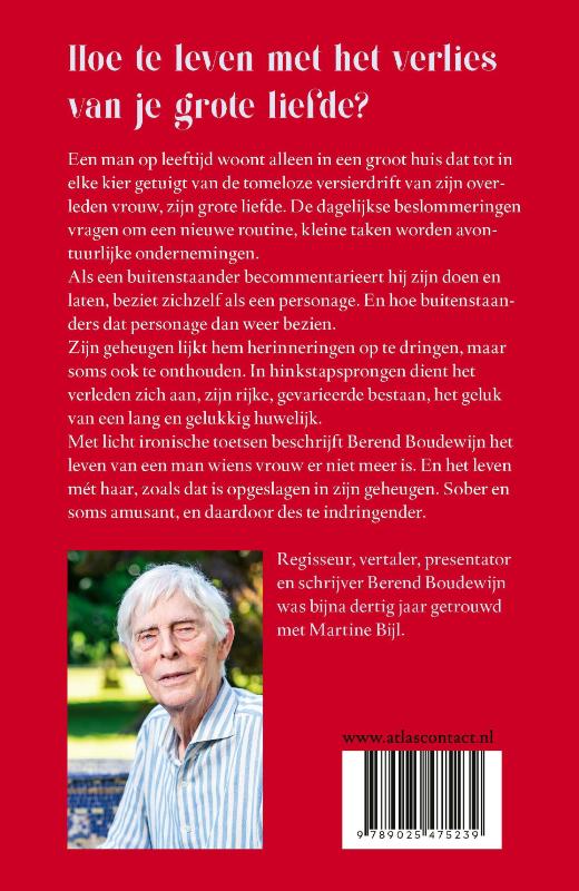 Met licht ironische toetsen beschrijft Berend Boudewijn het leven van een man wiens vrouw er niet meer is. En het leven mét haar, zoals dat is opgeslagen in zijn geheugen. Sober en soms amusant, en daardoor des te indringender.